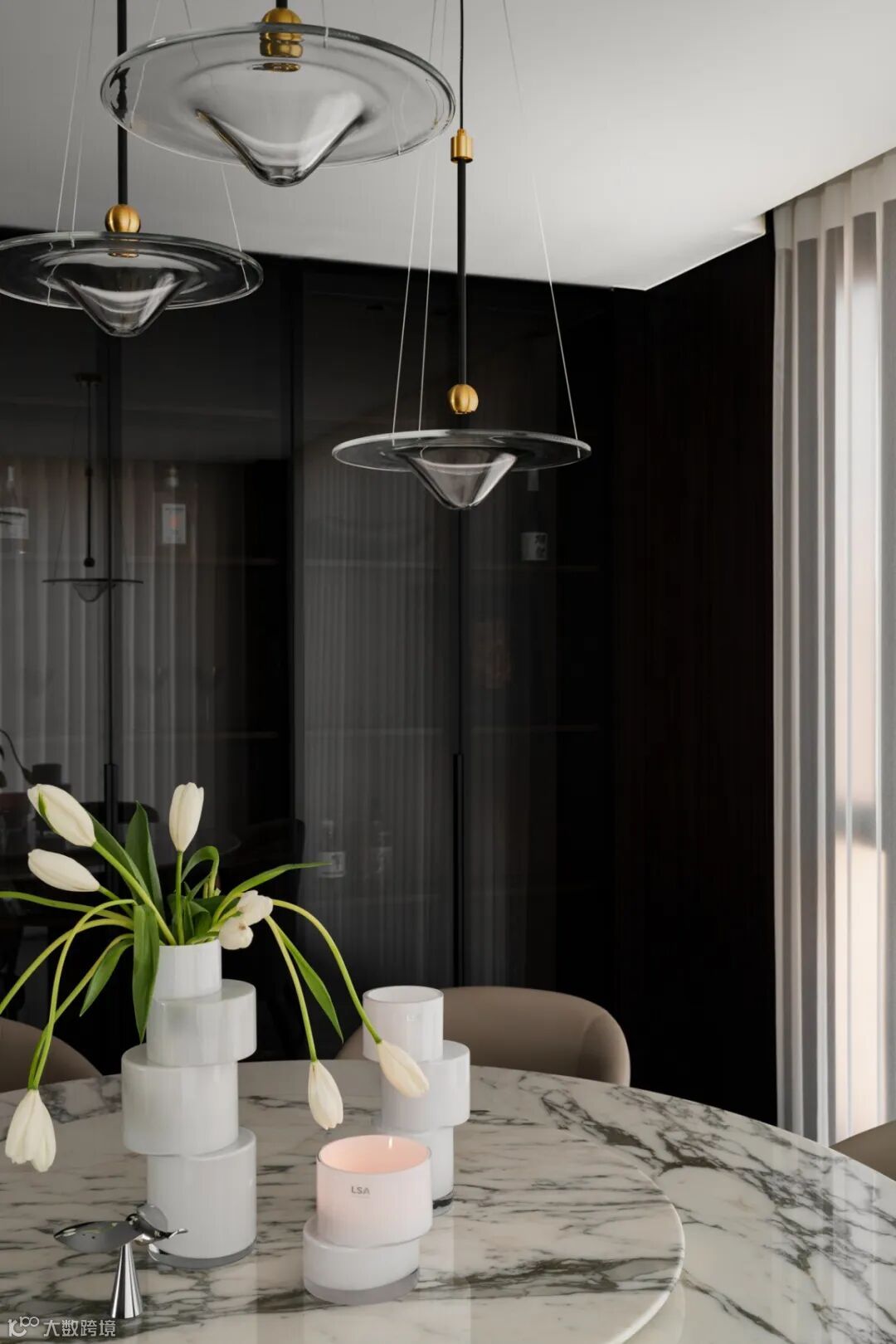 同时搭配精致吊灯,花艺装饰,既显时尚大气,展现现代家居对空间利用与美学体验的双重追求。