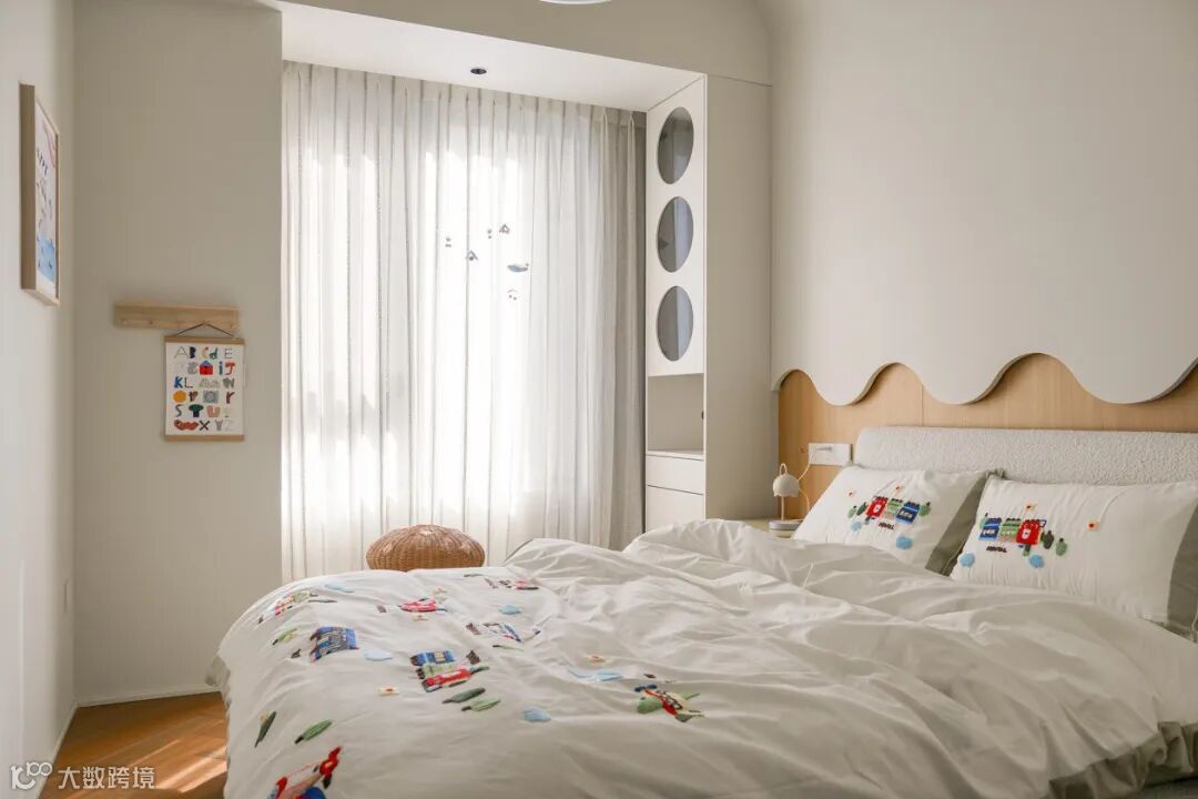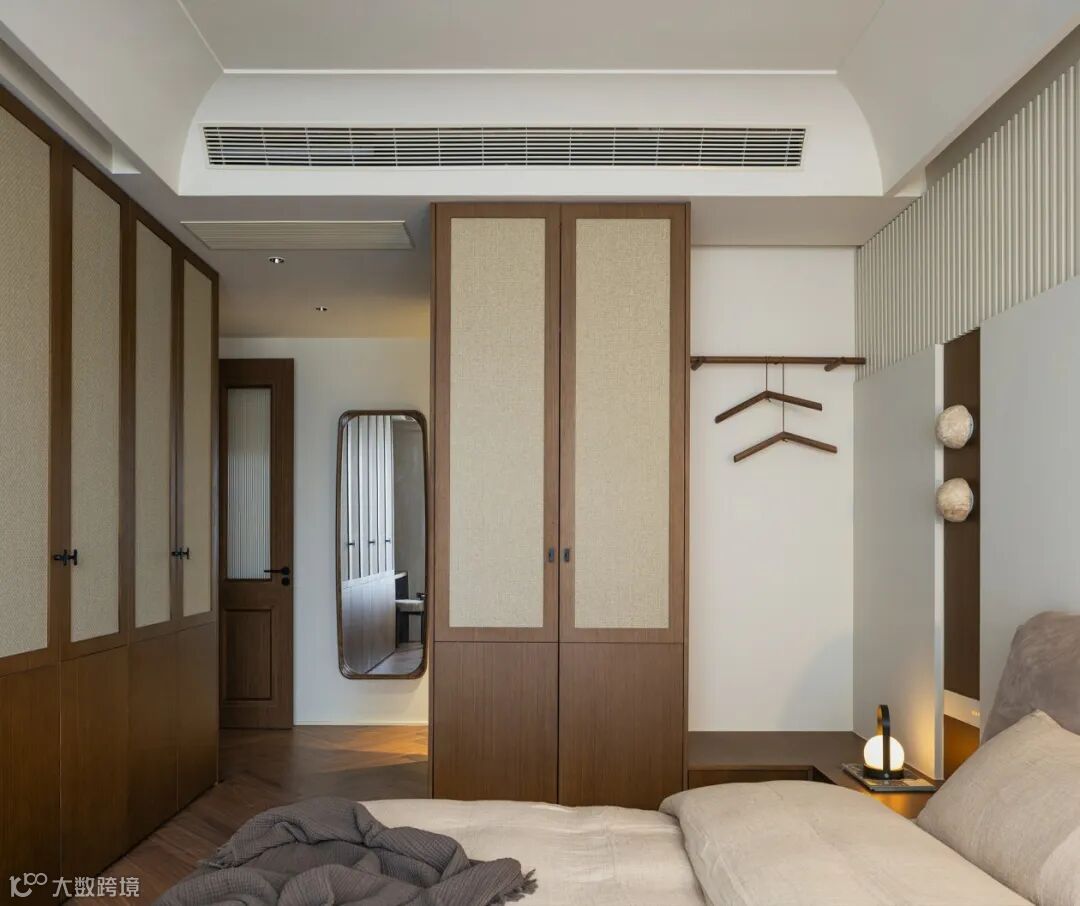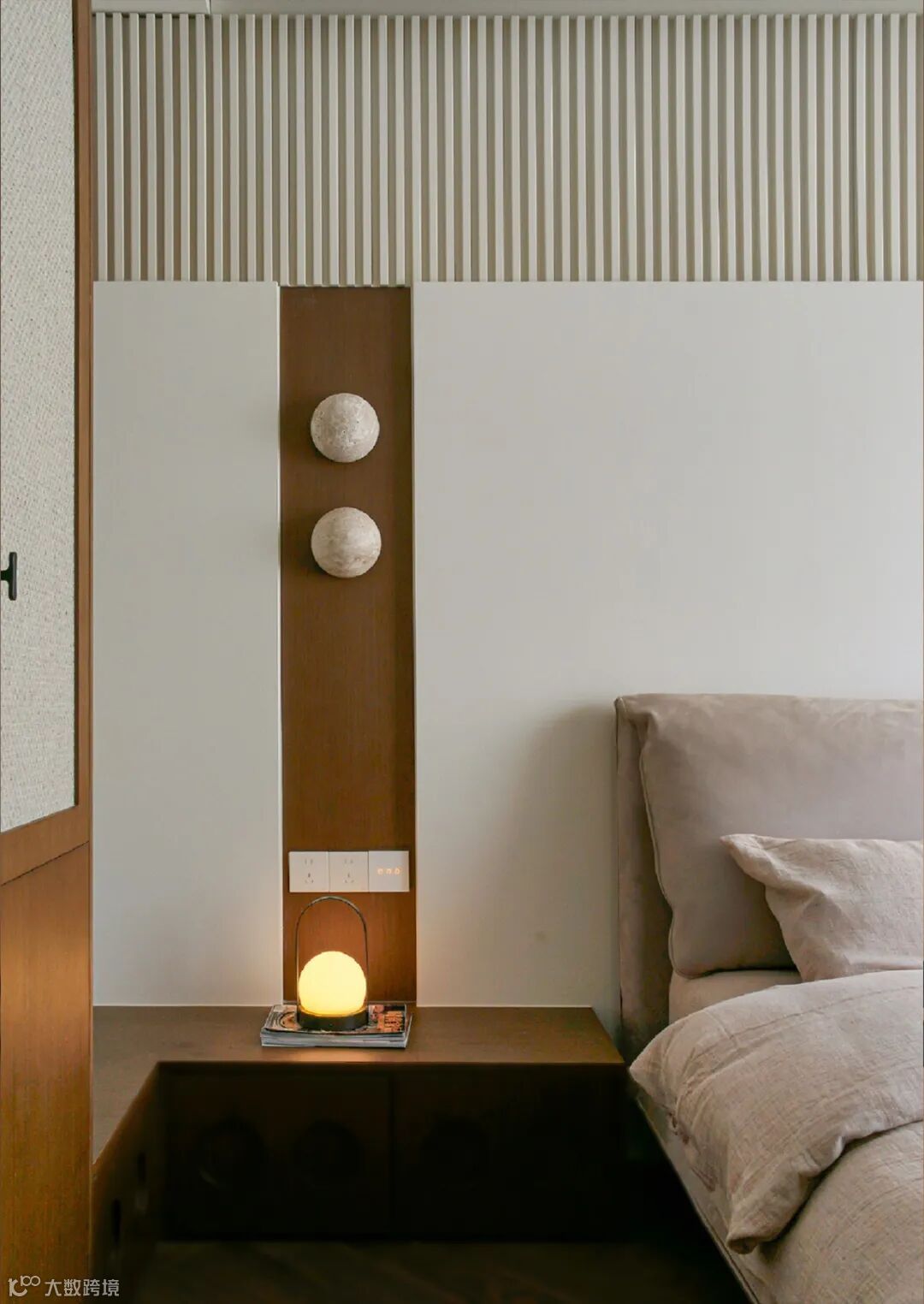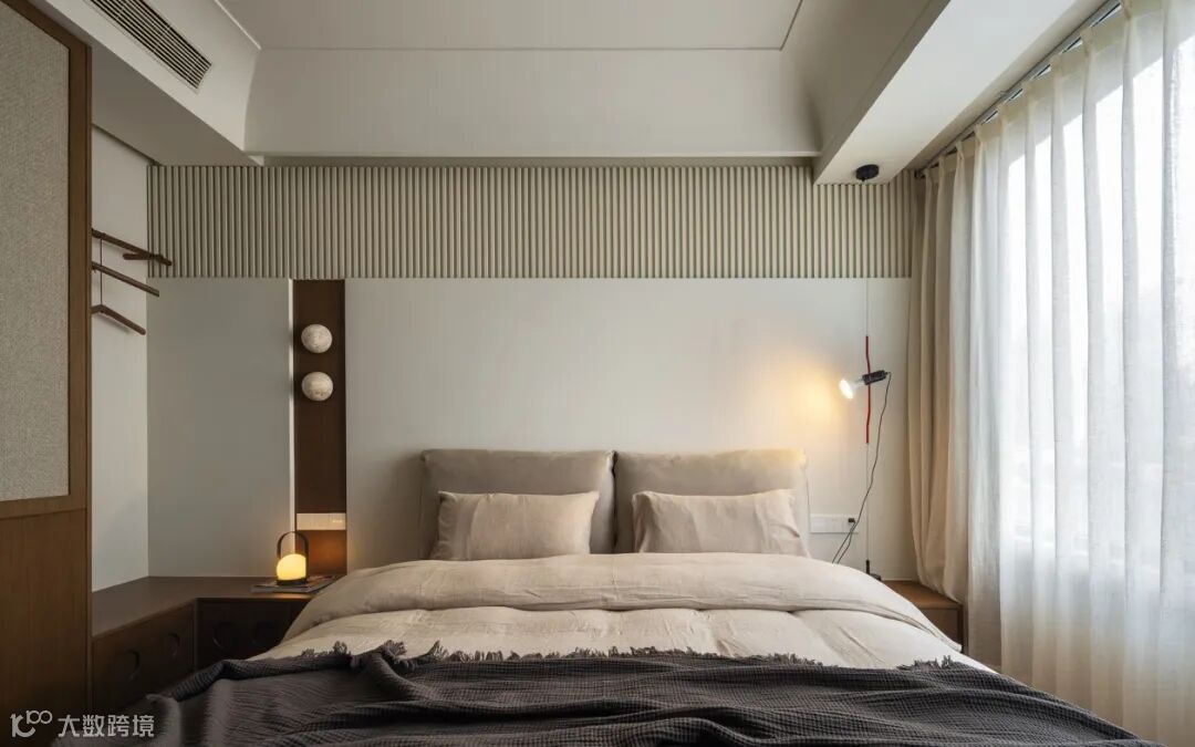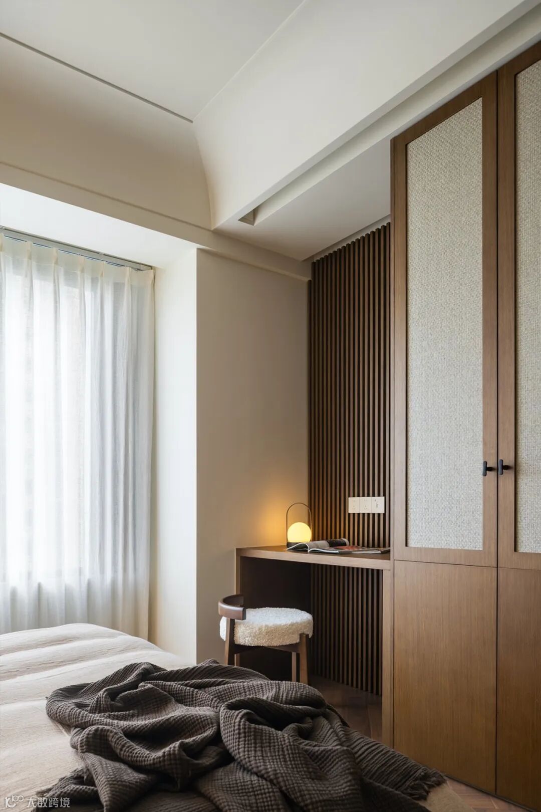 卧室,简约并富含设计,床尾整排储物和侧边的柜体补充,共同圈出了卧室的休憩氛围,收纳要求足够多且隐形,变得具有可观赏性。