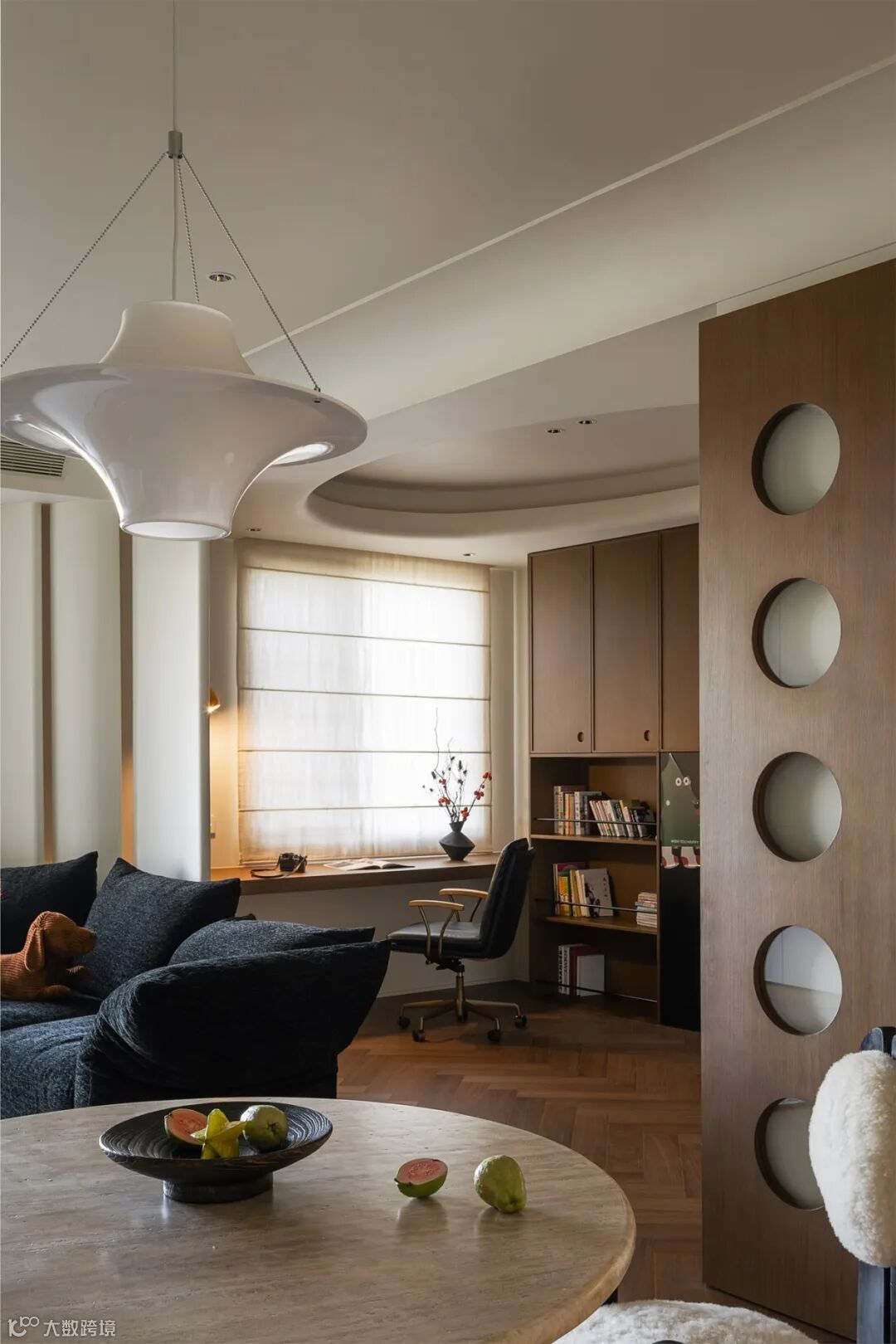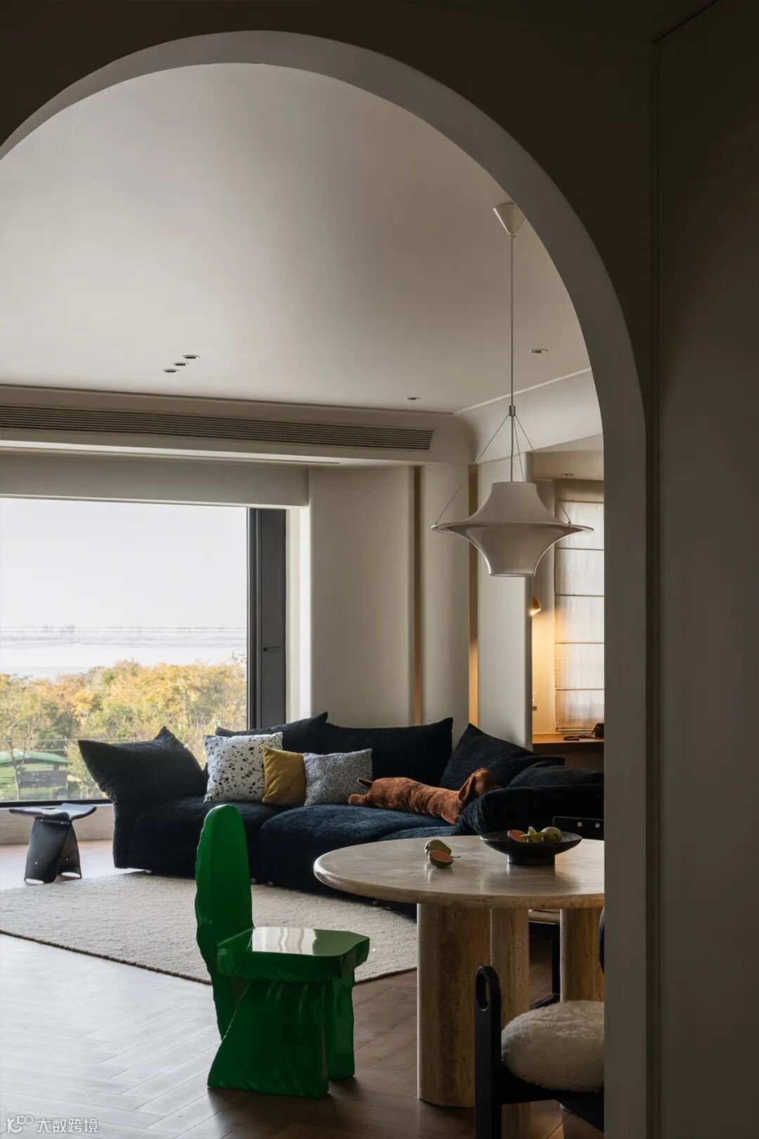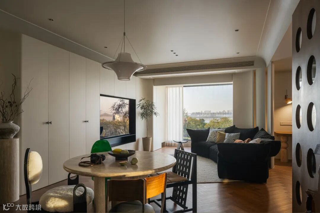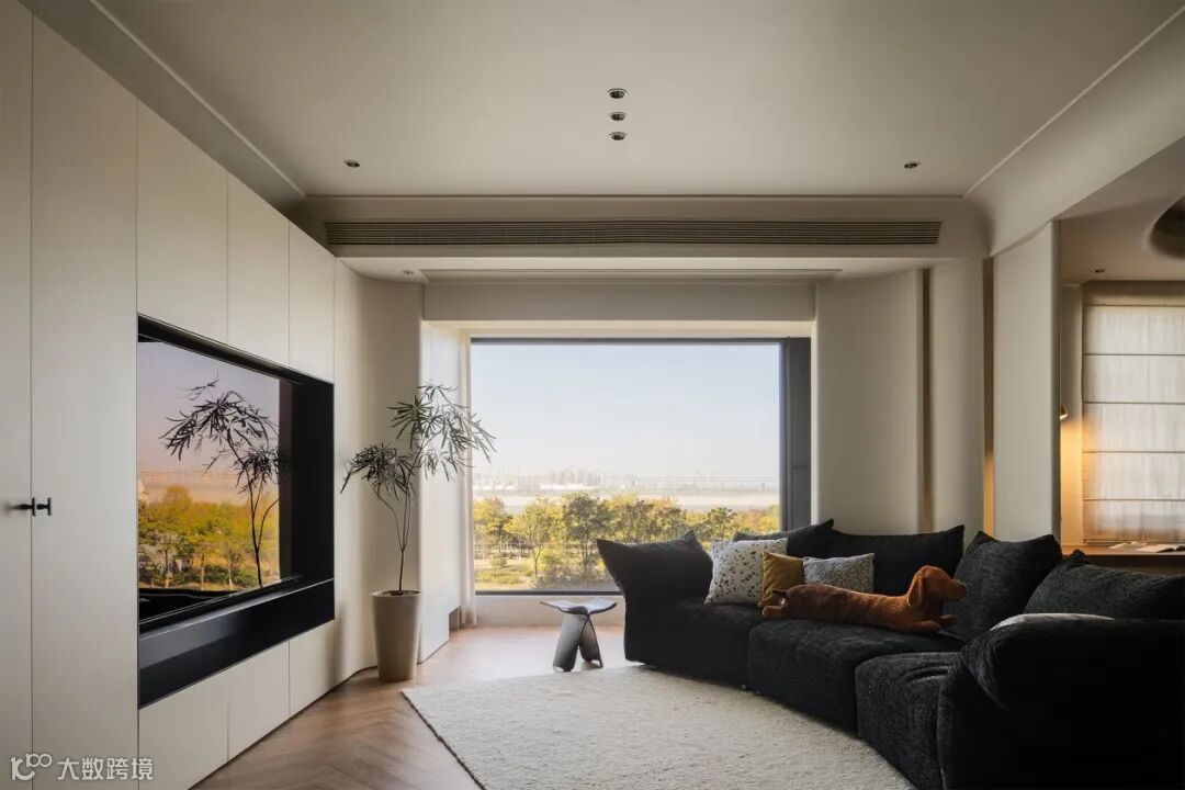 在客厅里,窗户被有意突出,隐于墙面的收纳和屏风结构,顺势卷涌向前,最终在阳台处聚拢成一面巨幅的自然画框,被倒映在室内的四季景色,也将成为这个家的亮点。