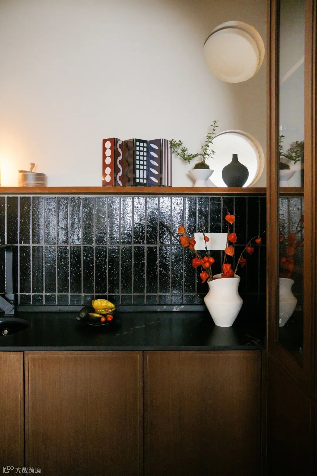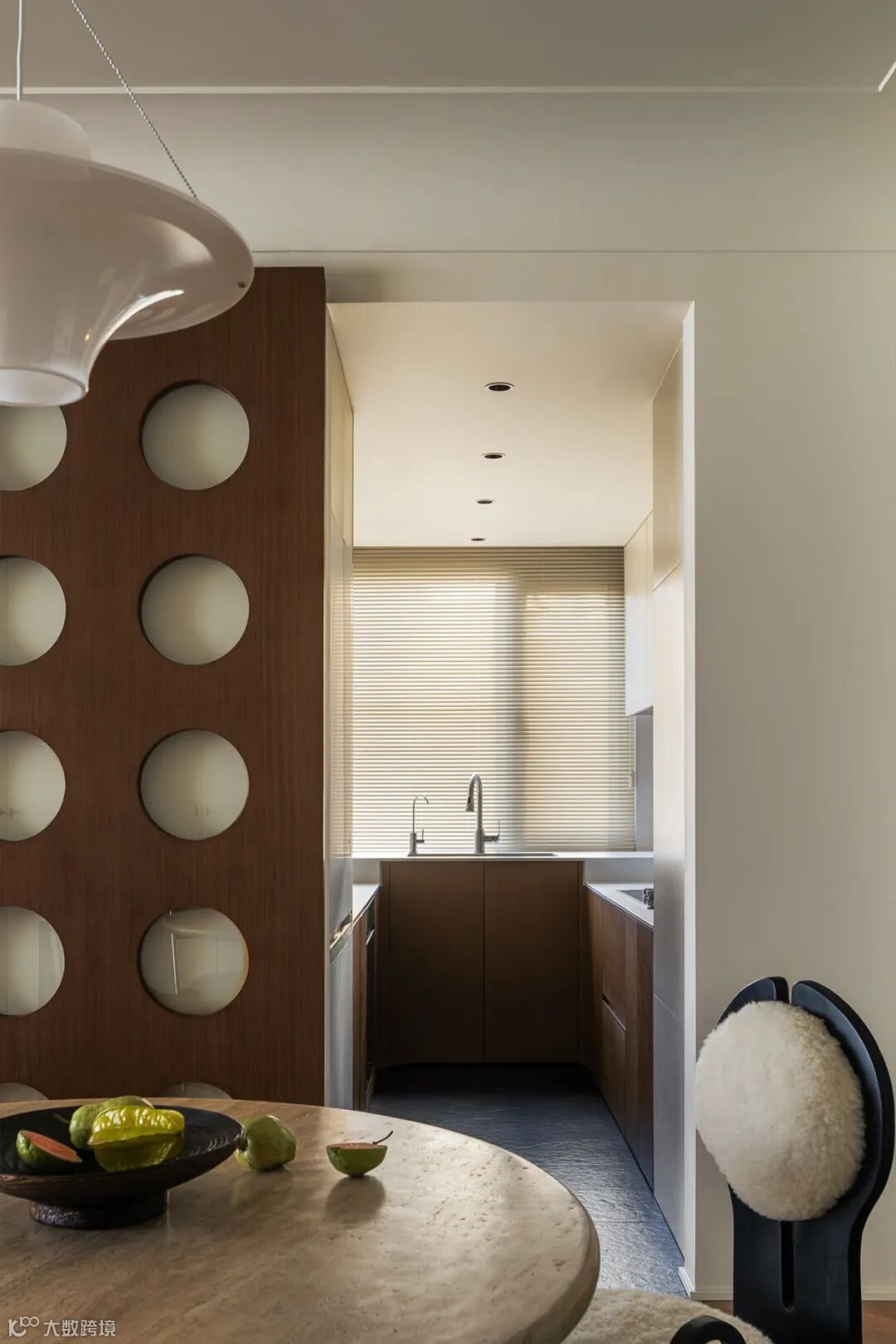 西厨采光并不是最佳的,因此在墙面画出了两个圆圈,借用了背后走廊的光线进入,这个小空间也会有呼吸感。