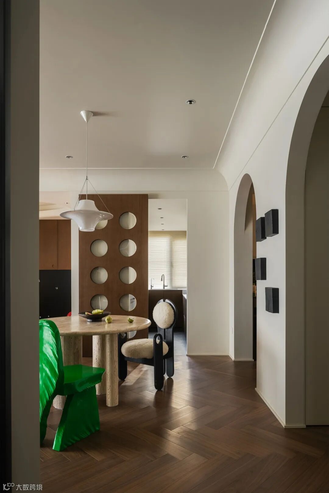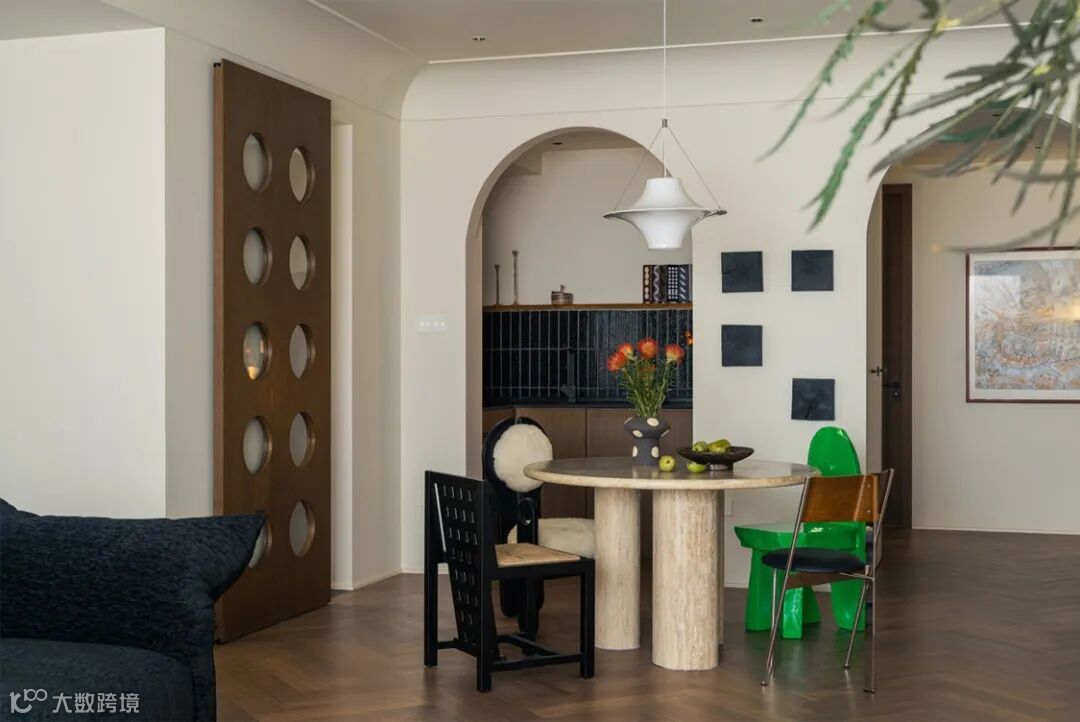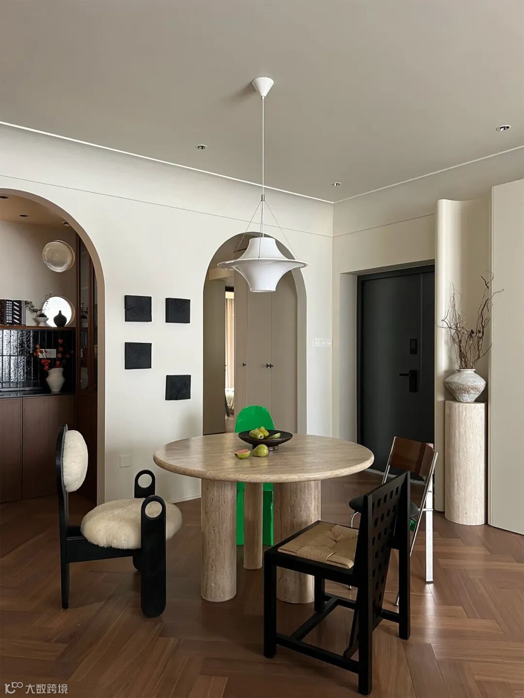 餐厨空间,圆形设计,搭配风格各异的椅子,为空间增添几分活泼与个性。