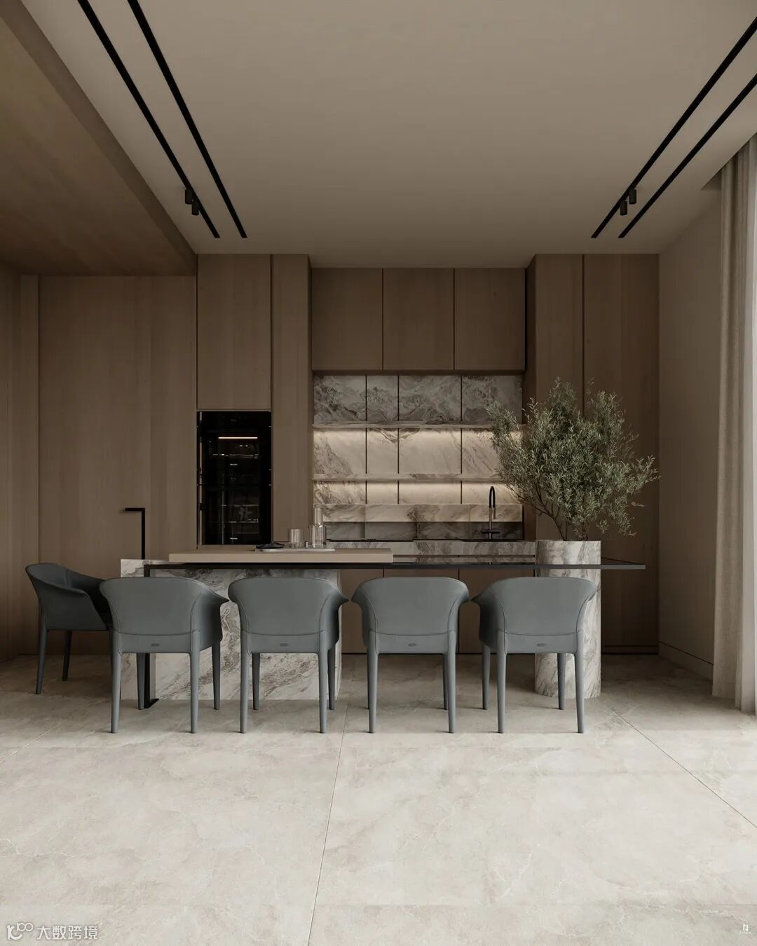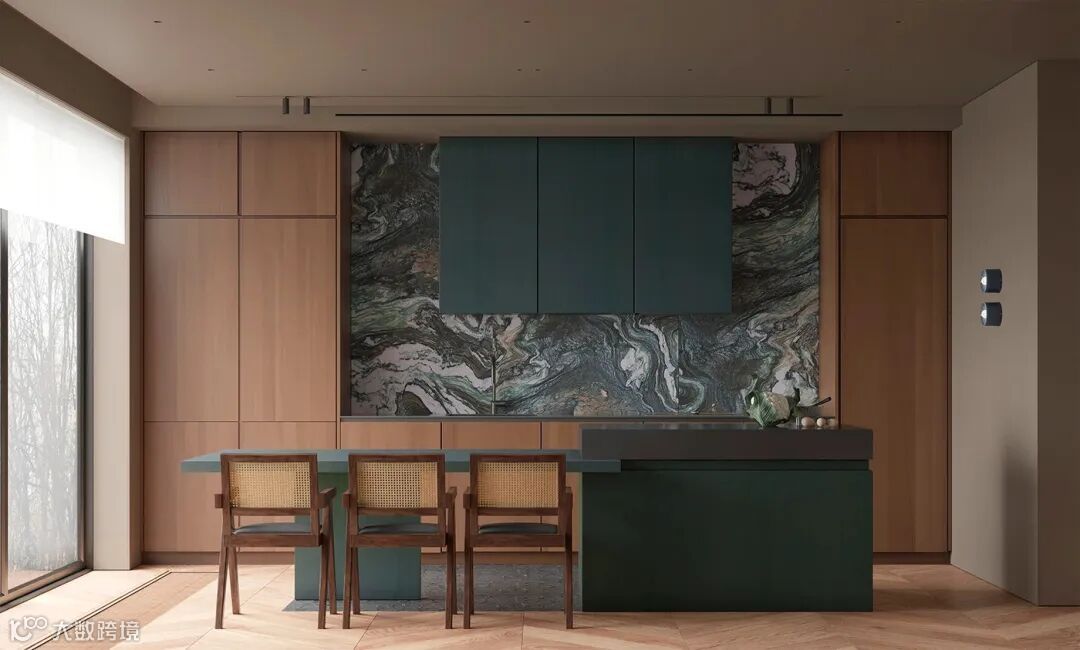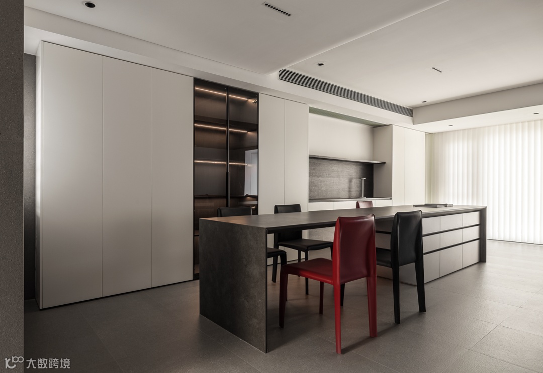 门板搭配无把手框架,柜面的岩板台面泛着细腻的光泽,隐藏式灯带从层板下方漫出,打造别具一格的氛围。