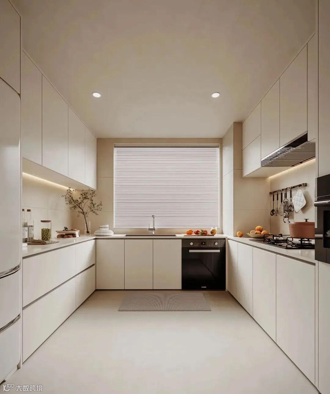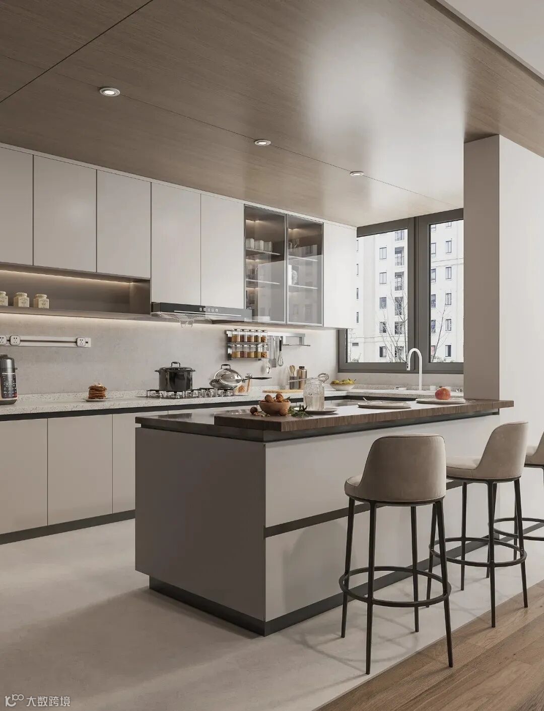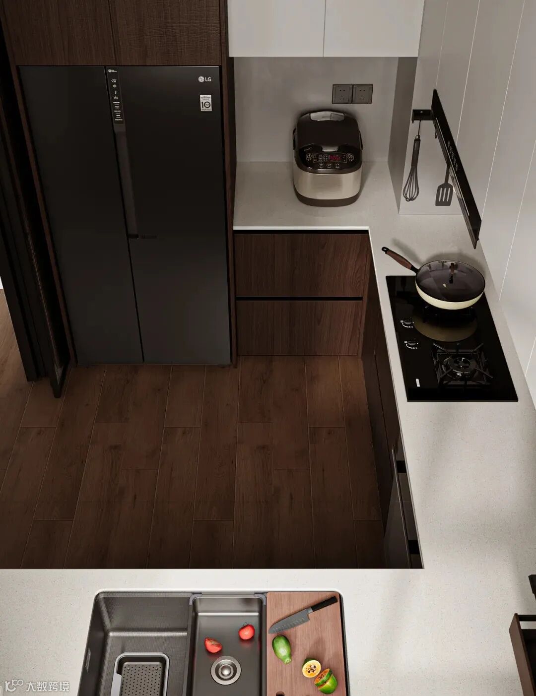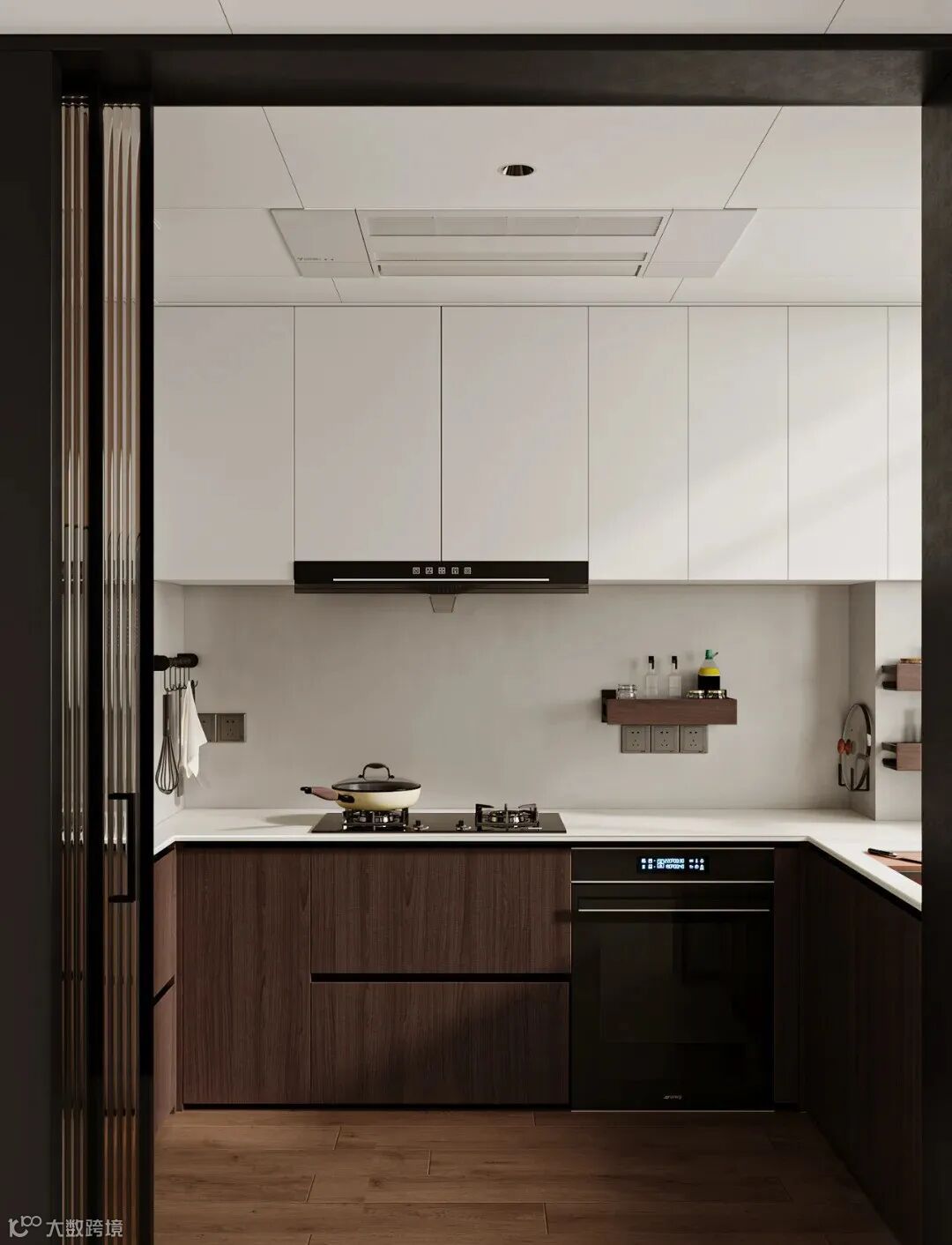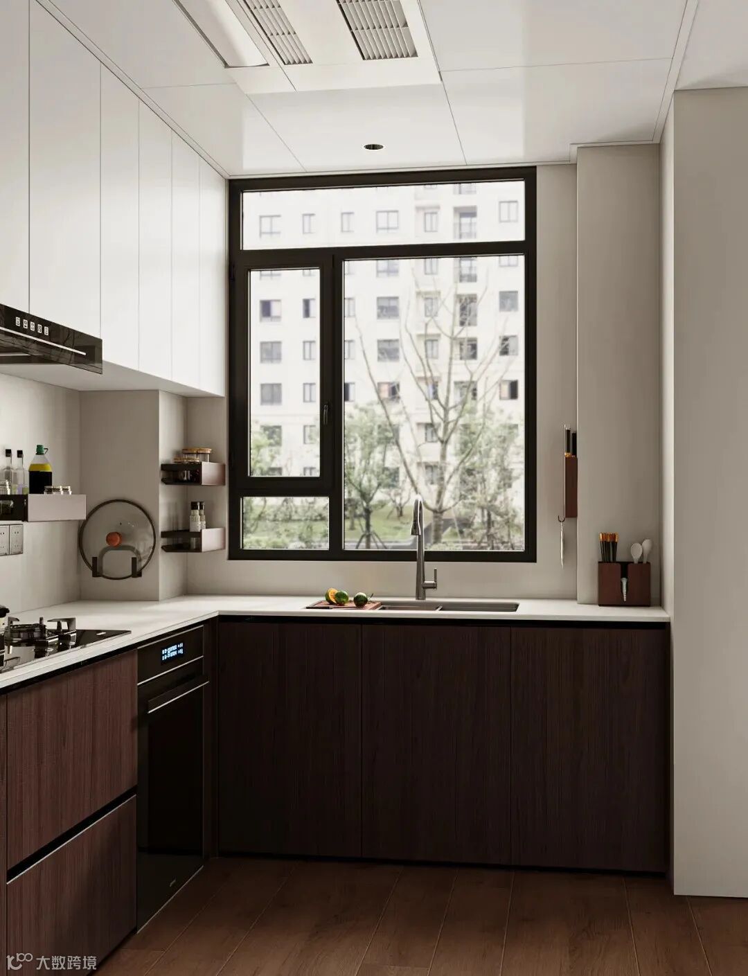 拉进是贯通转角设计的厨房区域,窗户打光也让厨房更有烟火气,同时顶柜的玻璃储纳开合门设计更是厨房的点睛之笔。