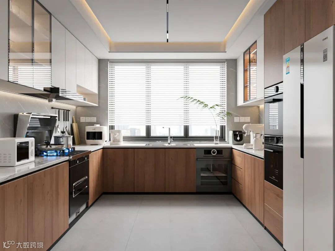 U型厨房设计,整体布局高效利用每一寸空间,流畅的操作动线,让烹饪变得得心应手。胡桃木+白色的搭配,提升氛围感的同时又显得十分温馨。