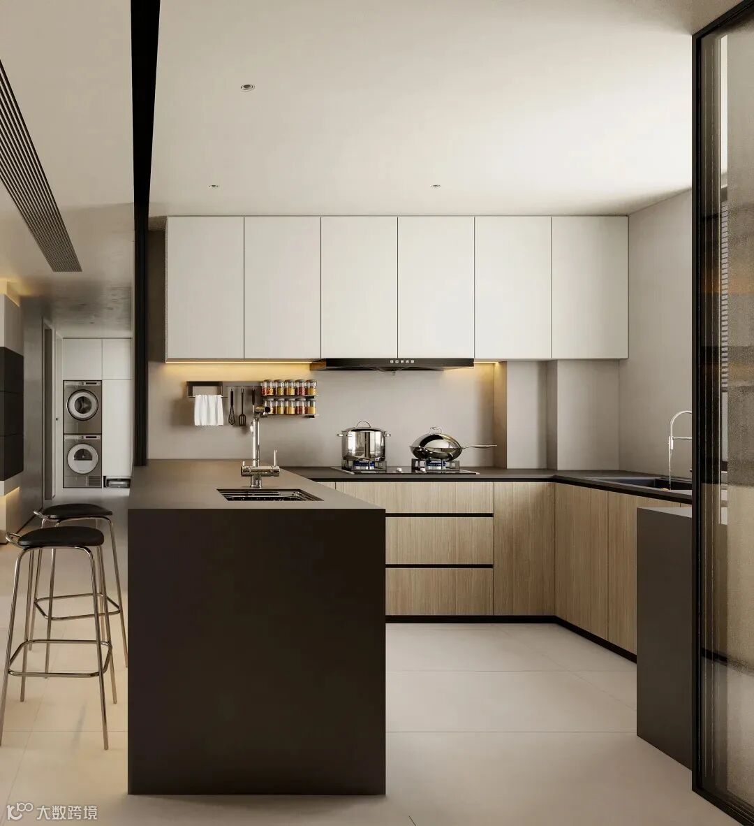 半开放式厨房独有的生活气息,u型厨房+岛台的设计,增加了厨房的操作台面,也增加了收纳的空间,用联动推拉门做隔断,让空间更灵活。