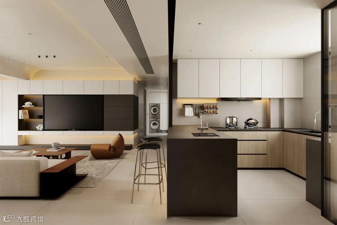 半开放式厨房装修,解放了空间,同时也让空间更加美观!中央岛台不仅可以会客跟聚餐用,底部的储纳更是满足日常收纳。
