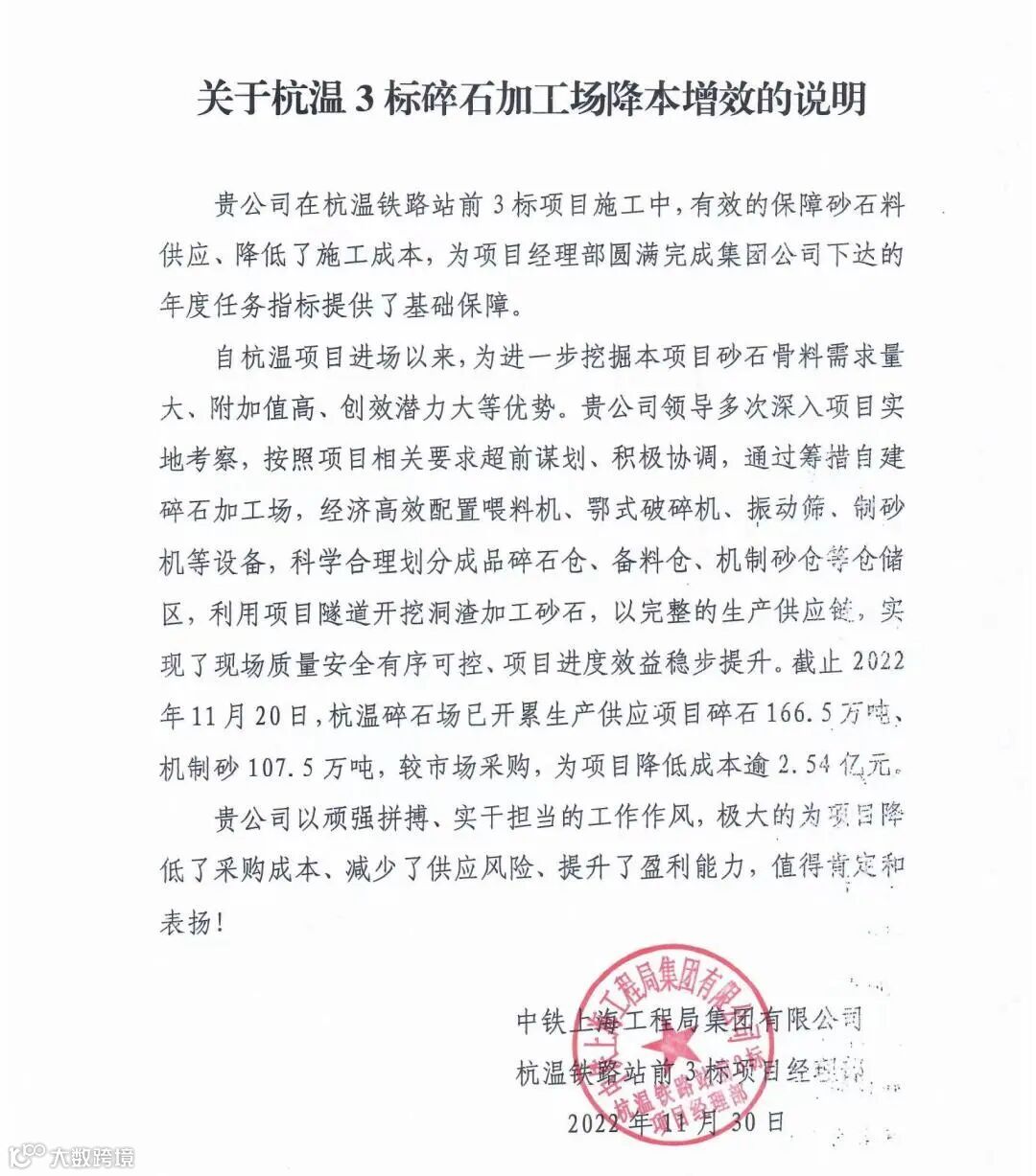 为降低项目施工成本,贯彻落实集团公司关于试点建设机制砂采石场的战略部署,2019年5月,地材事业部顺势而为,以福厦铁路项目为试点,着手建设福厦砂石加工场,加快推进地材生产加工业务,在建设过程中对场地选址、设备选型、安全环保、生产能力、质量管控进行重点策划,同时在产品质量方面达到铁路技术标准要求,并顺利通过业主单位验收实现投产,为后续益阳、杭温、成达万砂石加工场建设积累了宝贵经验。在杭温加工场建设过程中,地材事业部充分结合福厦加工场的厂建经验优化生产工艺流程和设备型号,合理利用隧道洞渣开展生产加工,减少弃渣占地,先后自建四个砂石加工场,有效降低项目建设成本,累计为杭温铁路项目供应360万吨碎石和机制砂,担负了生产加工重任,发挥了物贸公司的降本保供效用。