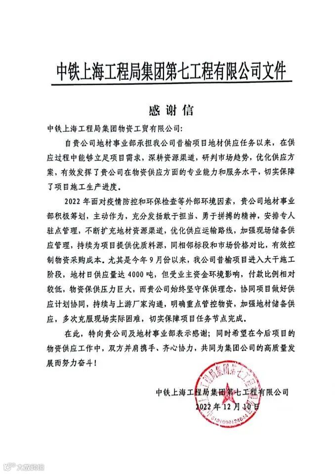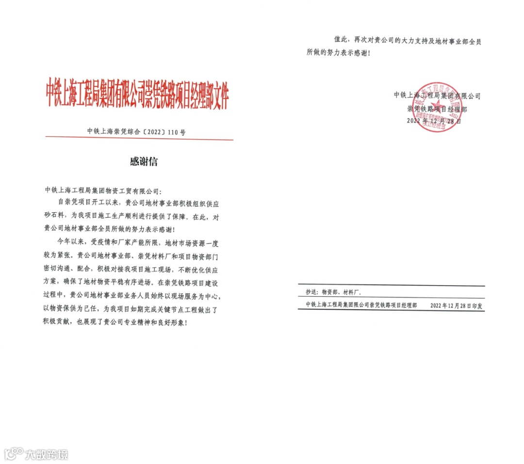 成立伊始,地材事业部秉持公司“保供促销、守信践诺、稳健经营、持续发展”的经营理念,建立地材业务“强资源、保质量、优服务、促供应”的服务理念,依托集团公司在建项目,精细“绣花”,重在服务,积极掌握保供需求,大力整合属地资源,奋力拉开地材供应序幕。自2019年保供南沿江铁路项目以来,先后参与了常益长、杭温3标、郑济铁路(山东段)、崇凭、包银、柳梧、沪渝蓉和淮宿蚌等19条铁路项目地材供应,统筹配置属地资源,完善供应方案,规划运输路线,加强动态管控,顺利保障了各承供项目的施工生产进度,为集团公司在建项目提供了优质高效的地材保供和质量管控服务,协同项目部顺利通过红线检查,多次受到公司和项目的表彰,有效彰显了物贸公司的专业供应能力与服务水平。