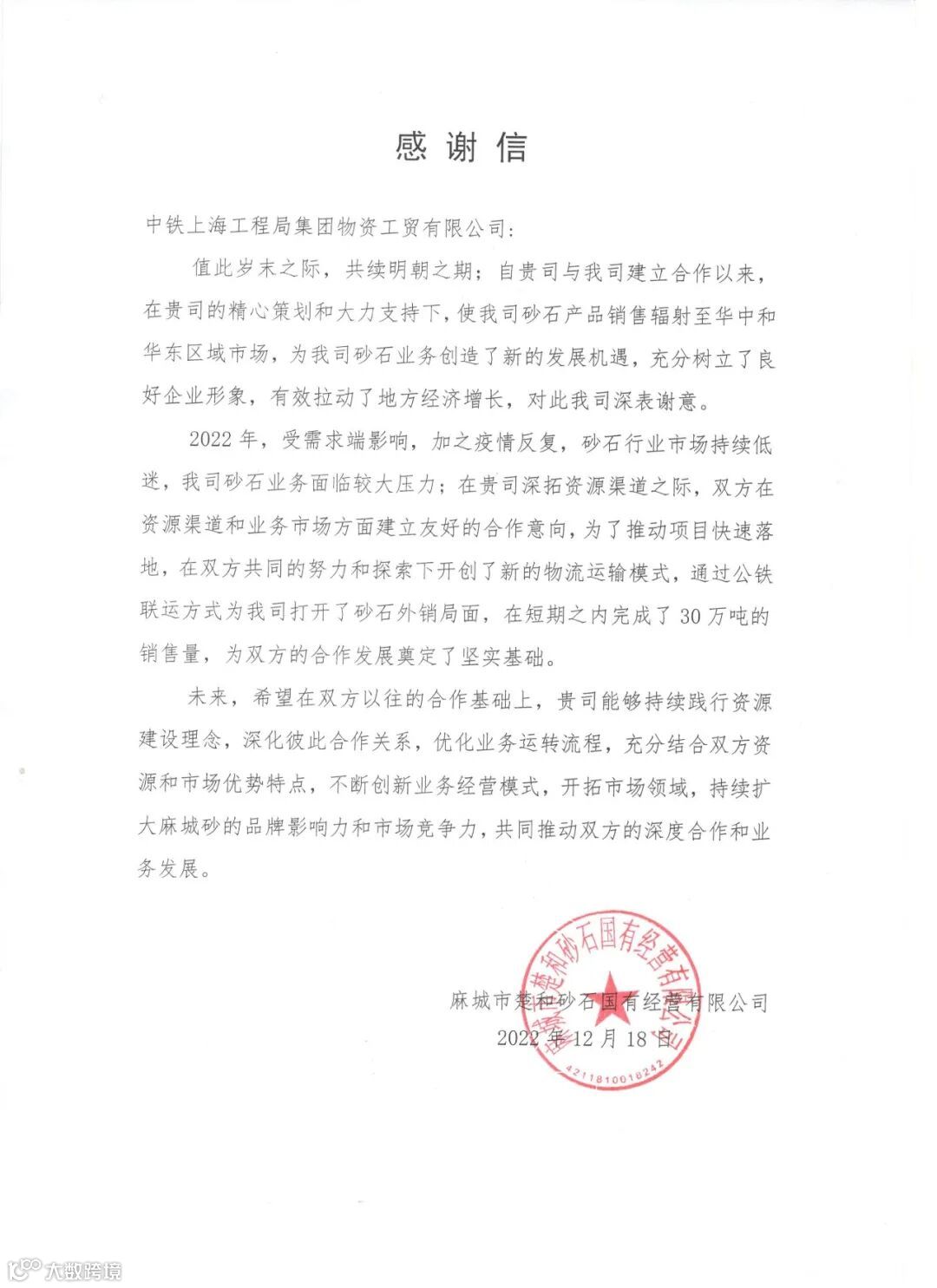 截至目前,物贸公司公铁联合河砂项目累计供应项目31.48万吨,5121.59万元,其中沪渝蓉项目22.49万吨,3446.04万元,供应淮宿蚌项目8.99万吨,1675.55万元。未来,物贸公司将不断加强麻城砂资源建设,深化各方合作关系,优化业务运转流程,探索多式联运物流模式,开拓地材市场领域,高效推动公司地材业务持续发展。