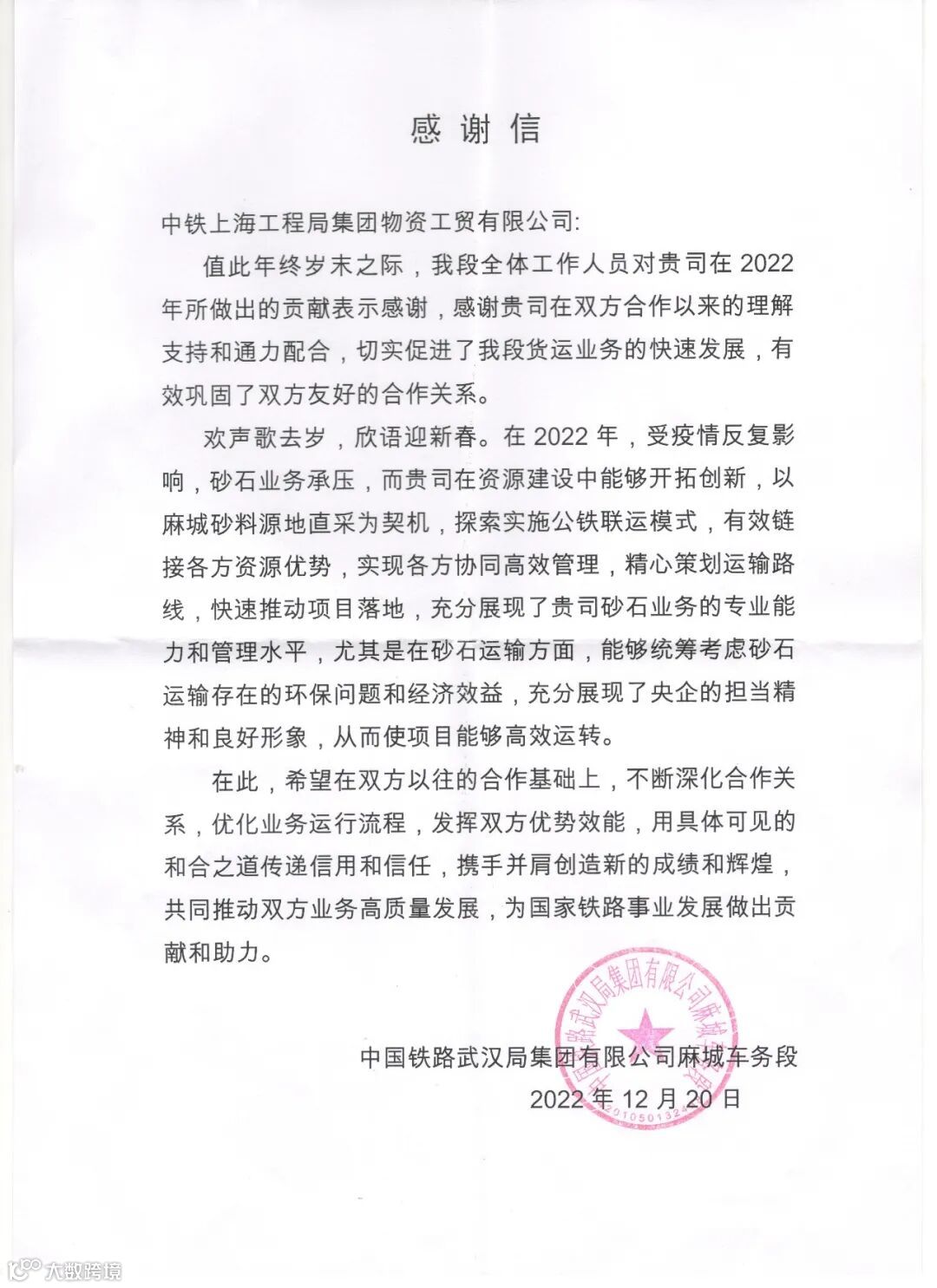自10月份以来国内疫情形势逐渐严峻,各地防控政策持续趋紧,麻城砂跨区域运输受到较大影响,且沪渝蓉和淮宿蚌铁路项目项目正处于大干施工阶段,物贸公司保供压力巨大。面对复杂局面,物贸公司地材事业部主动作为,积极筹划,有效协同各方属地资源优势,以此实现各方高效协同管理,强化项目供应方案,不断优化运输路线,加强过程动态管控,切实保障了项目施工生产进度,充分获得了各方的高度赞扬和认可。