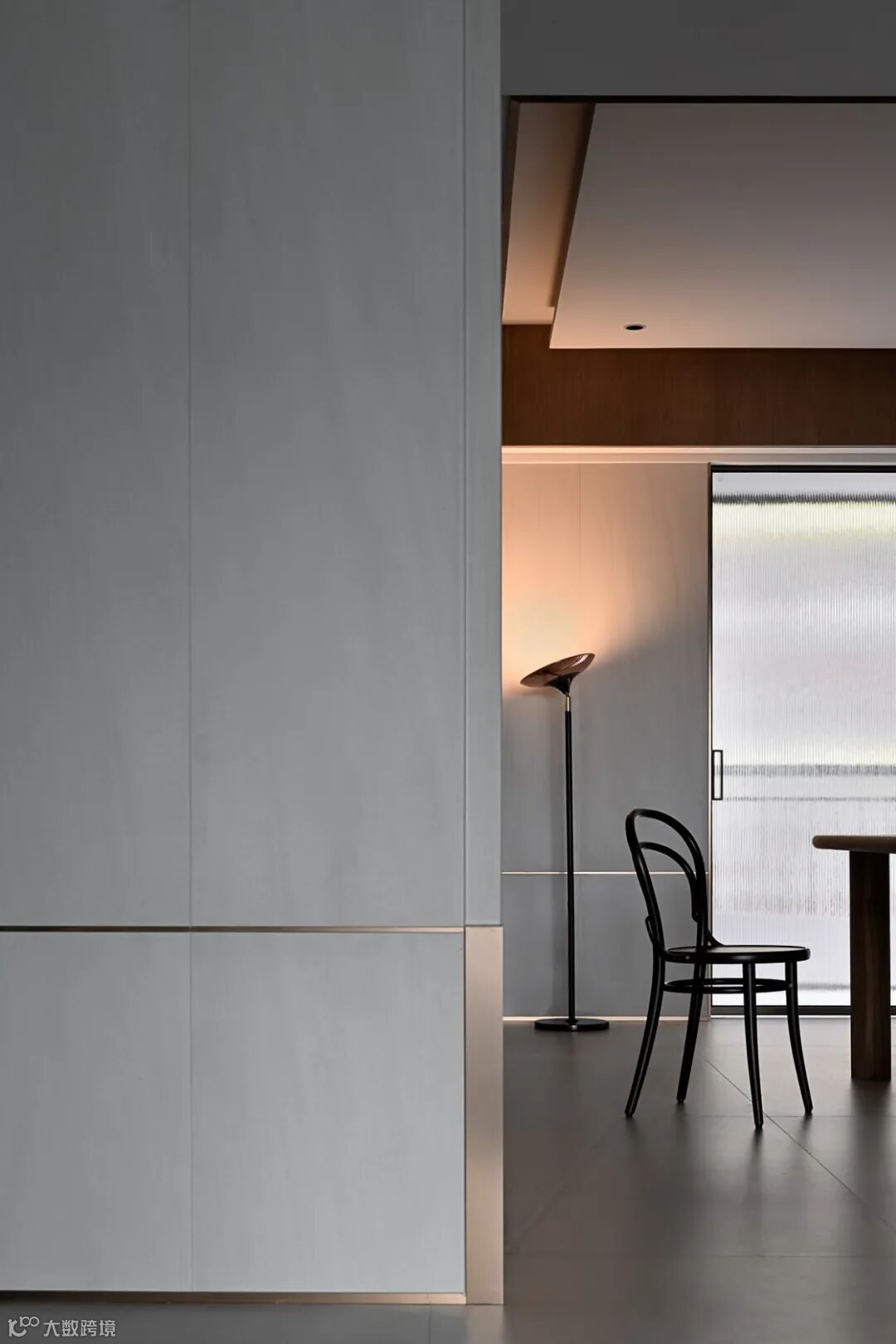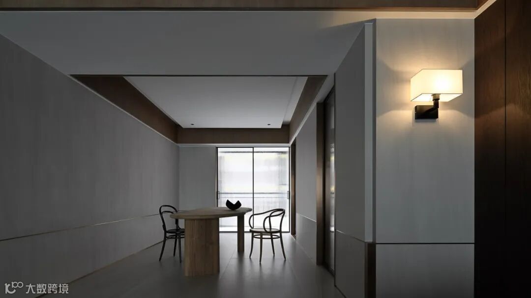 餐厅,极简设计,浅灰色调铺就空间背景,木质饰面,沉稳中透着雅致,柔和壁灯倾洒暖光,为空间披上温馨薄纱。
