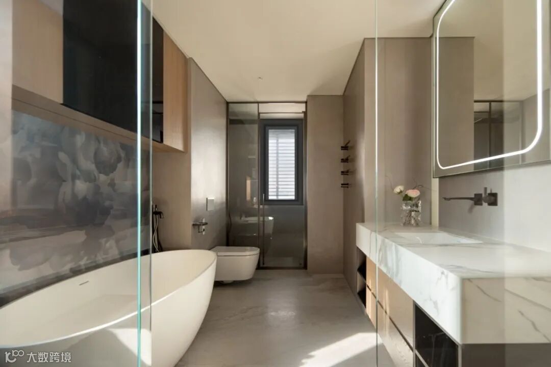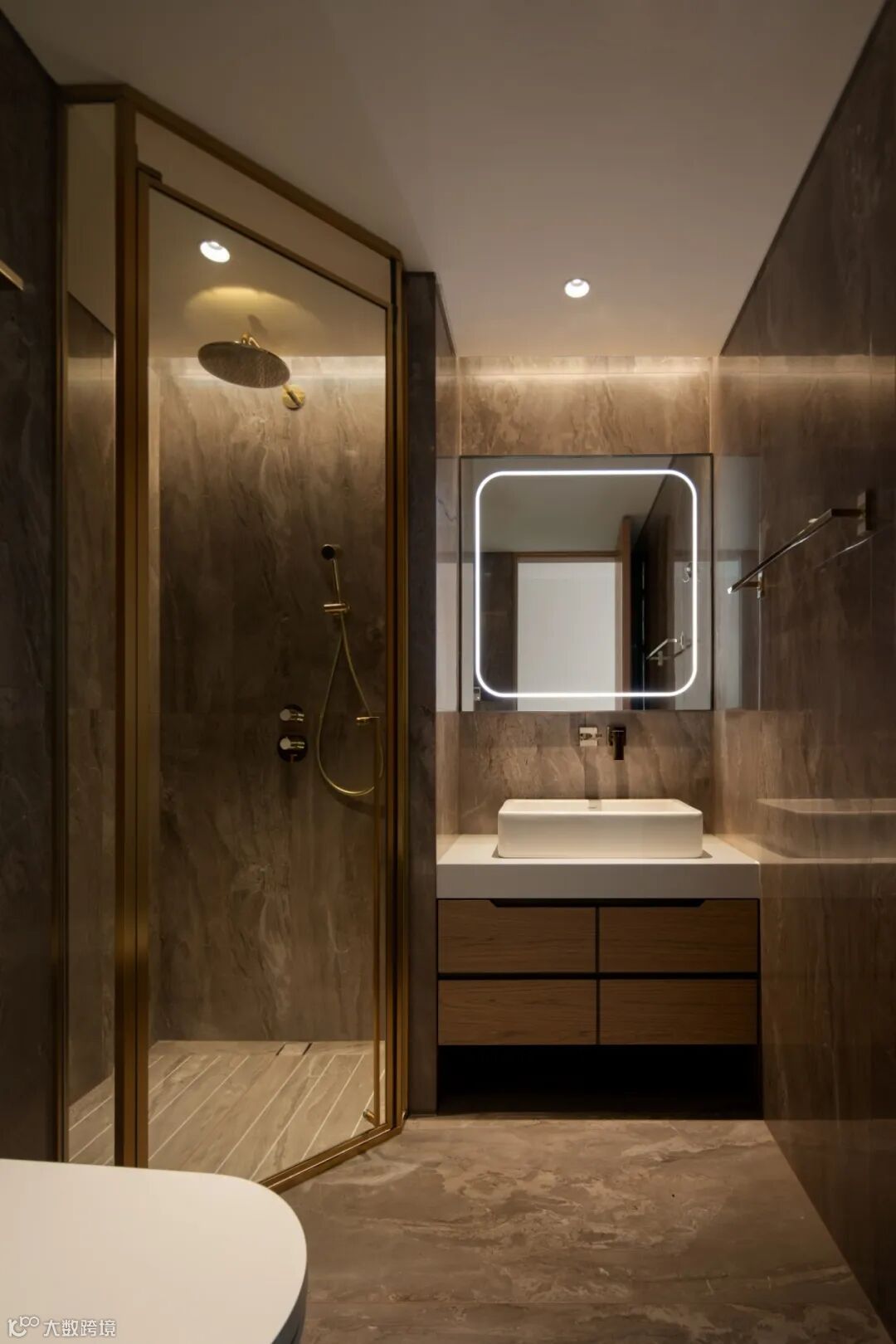公共卫生间,以黑色与木色交织,呈现出空间的极简美感,同时将洗烘设备,以干湿分离的形式进行分隔,让生活更便利。