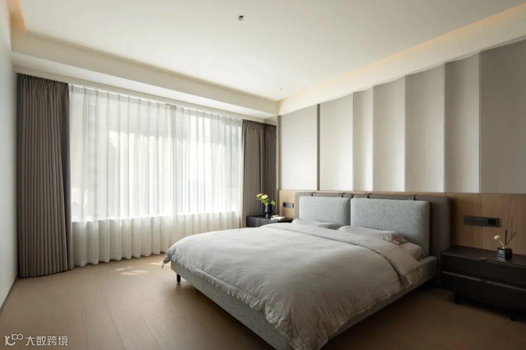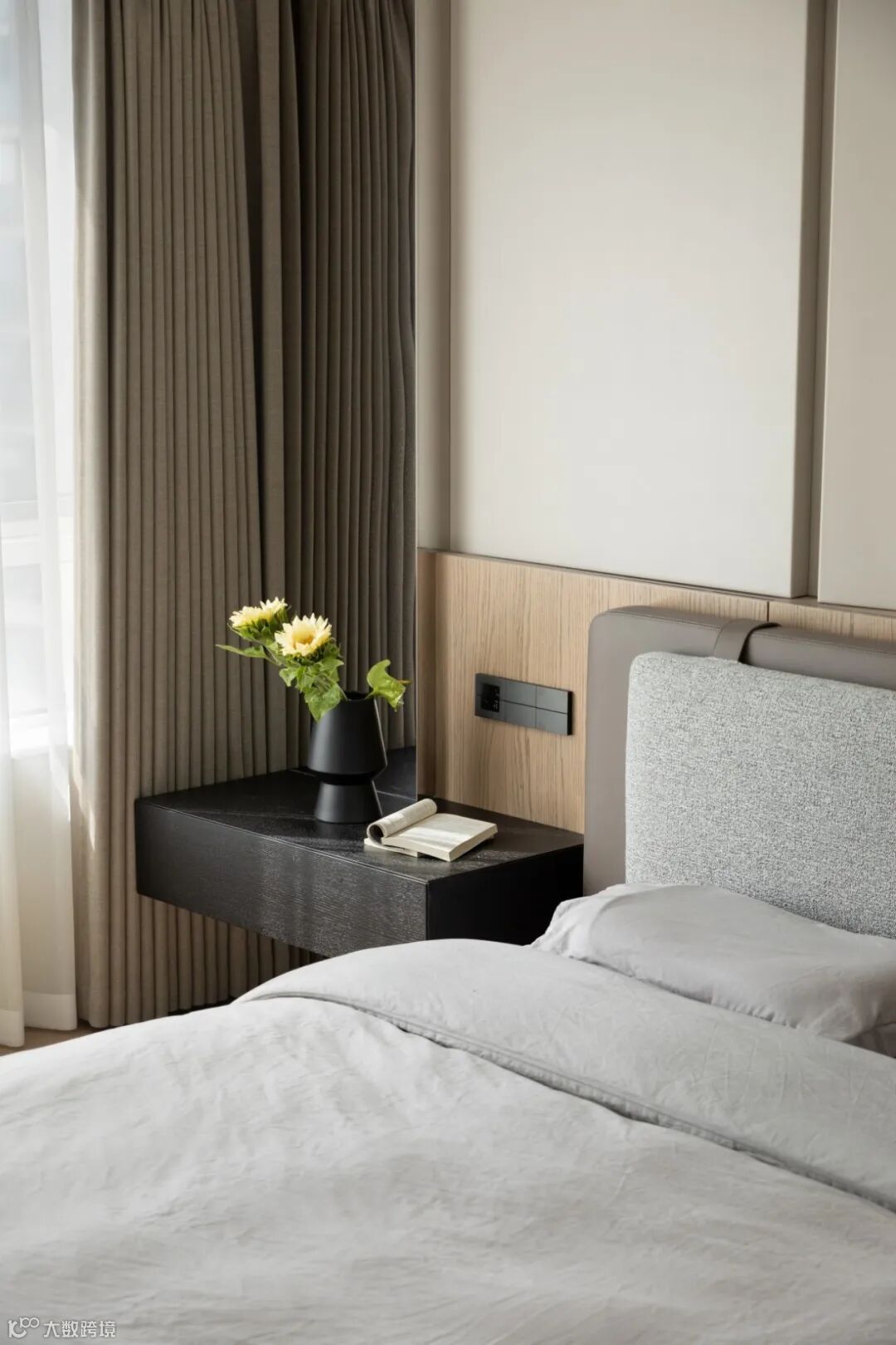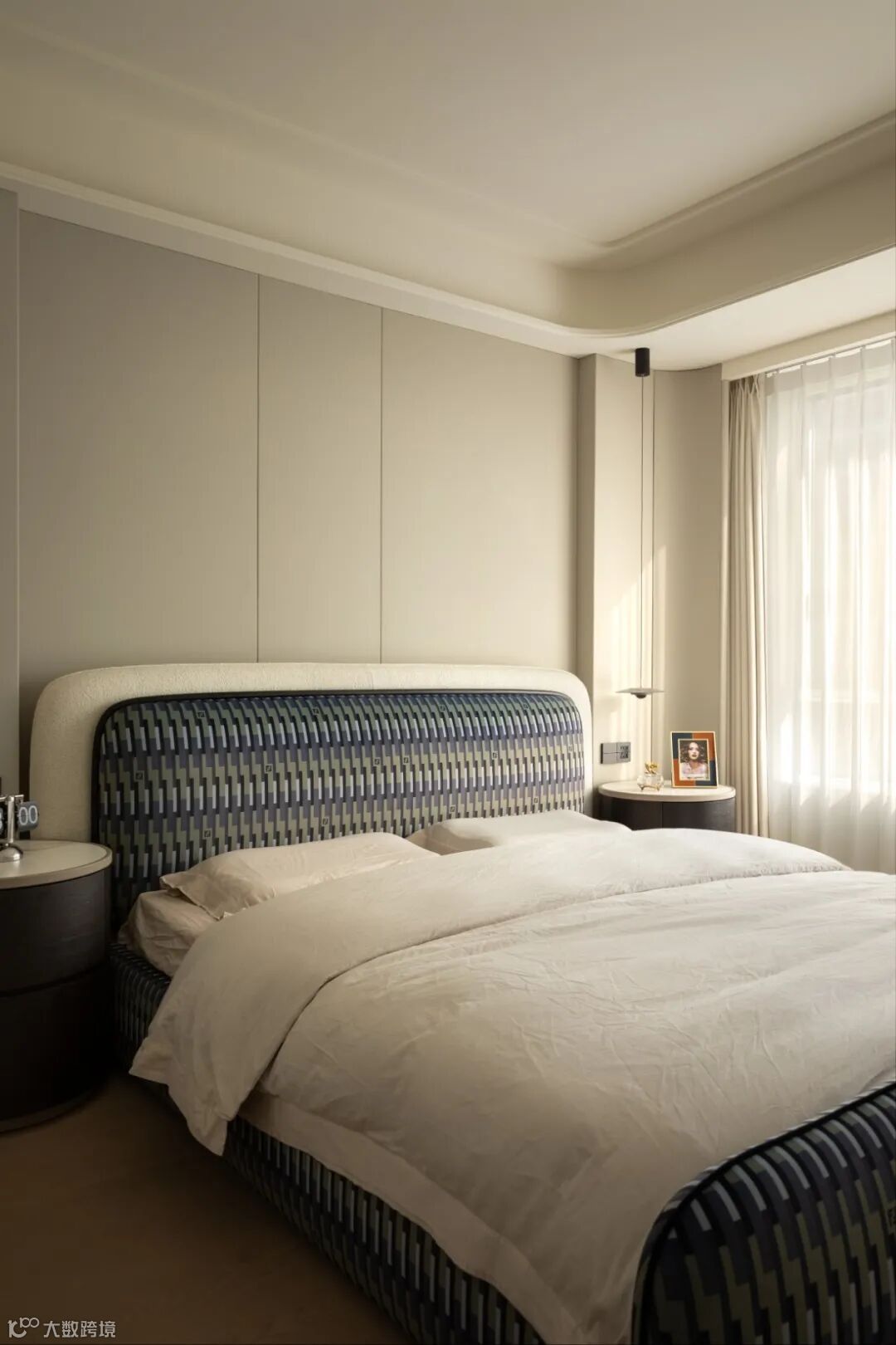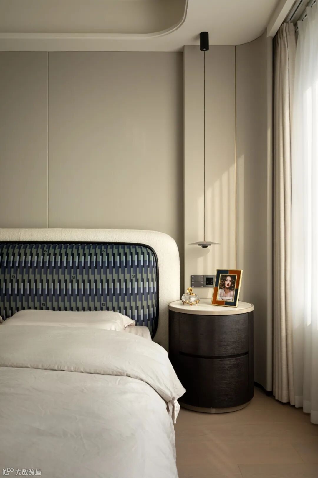 以人居体验为导向,材质、家具软装与空间发生对话,将舒适与安逸娓娓道来,床头背景的墙面及弧度造型设计,为睡眠区注入一抹灵动气韵。