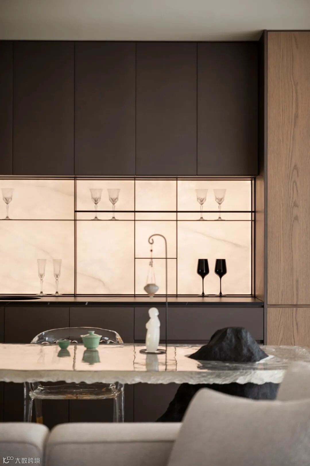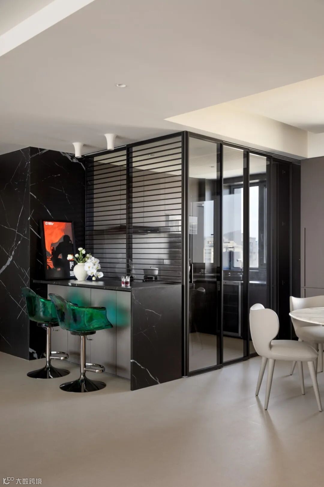 餐厨之间的边界,被刻意模糊。隐藏于柜体的玻璃滑门与屏风共同构成了半开敞空间状态,开合间既能有效隔绝烹饪时产生的油烟气味,也能随时与家人交流互动。