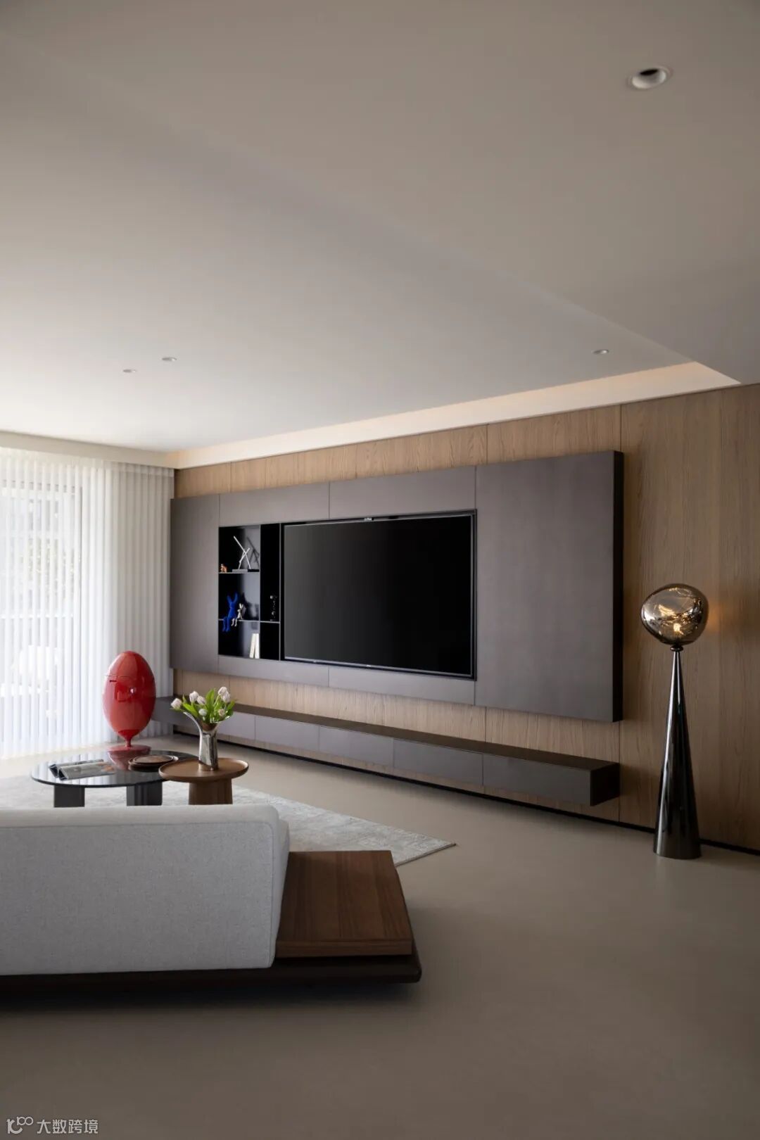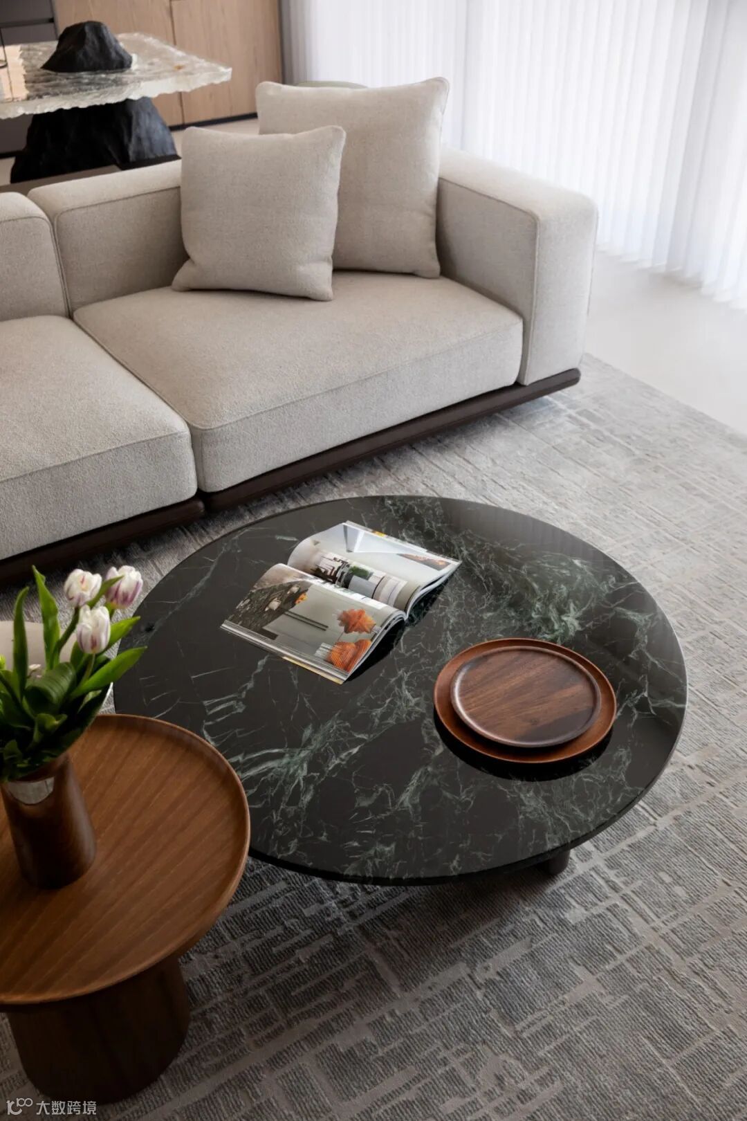 以纵向将客厅一分为二,打造多元交流互动场景。茗茶区,桌面形态不规则,似被时光雕琢的艺术品。桌上茶具错落摆放,莹润光泽与茶桌质感相得益彰。