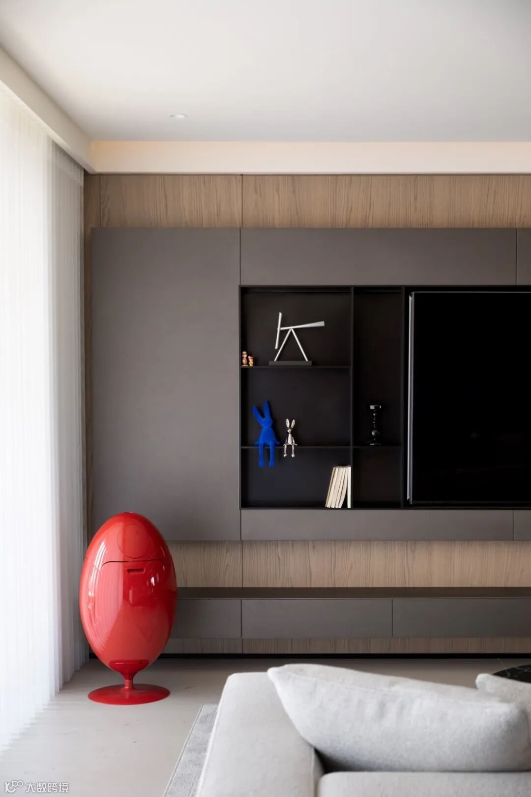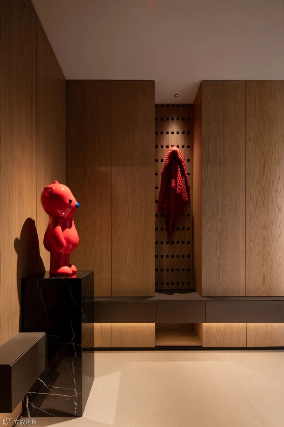 转而进入客厅,以暖色为基调,辅以深灰色金属漆,点缀于其中的红色,看似冲突的构成,实则合理又自然。
