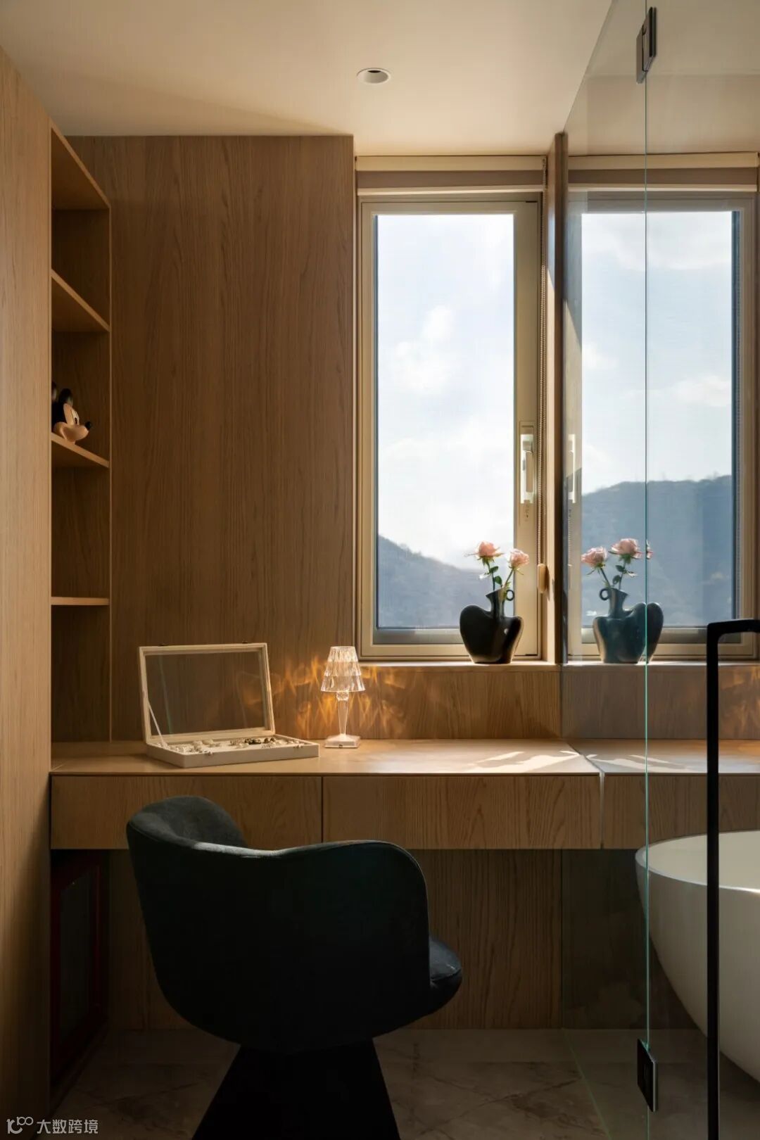 书房,木质色调为主,上方置物架错落有致,书籍与摆件有序陈列。百叶窗过滤光线,光影摇曳间,营造出静谧且专注的工作与思考空间。