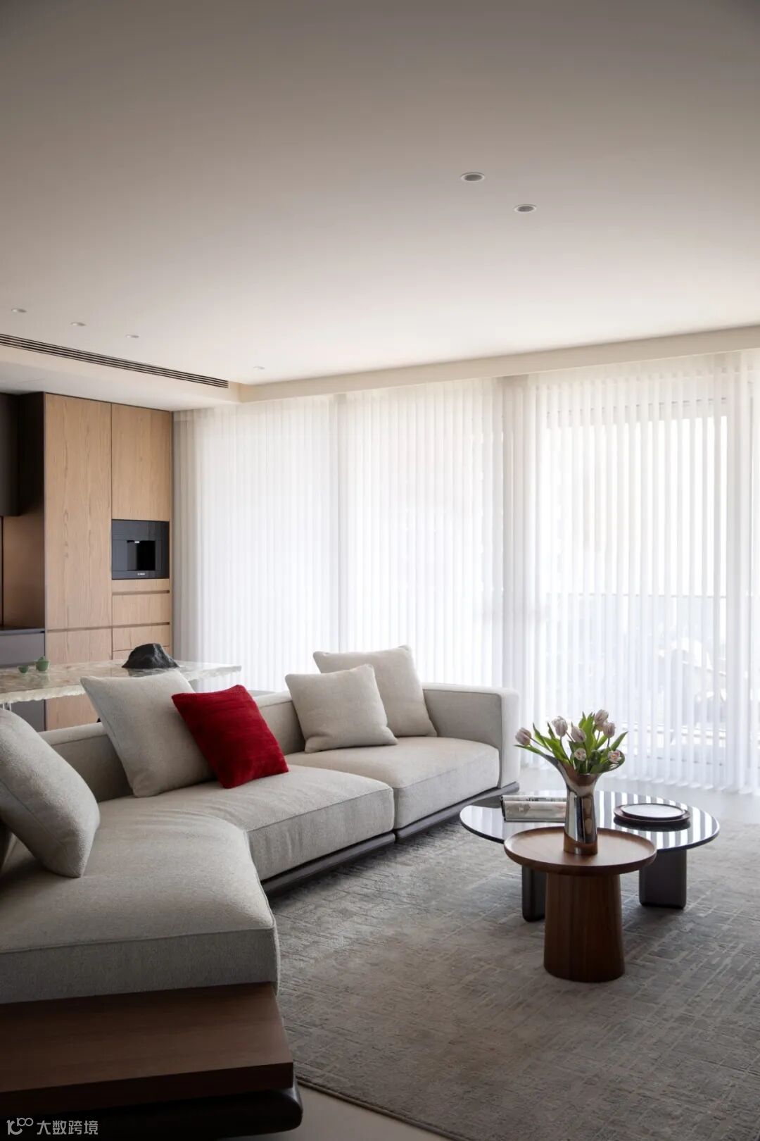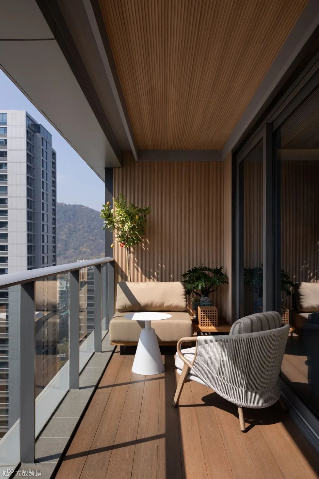 阳光夹杂着微风吹拂着纱帘,拉开窗帘,走出室内,驻足于阳台,一线江景尽收眼底。律动的光影与盎然的植物,将自然、轻盈刻入家的印记中。
