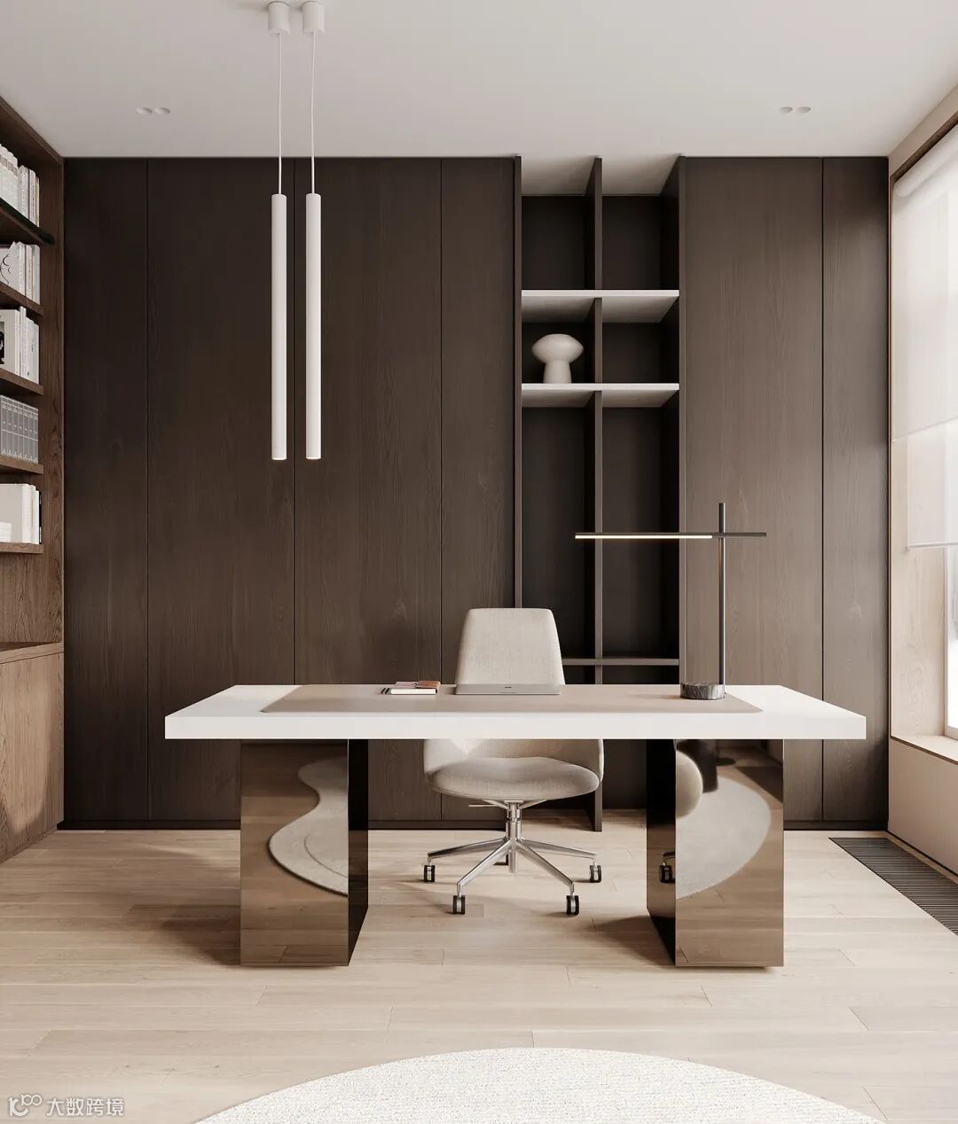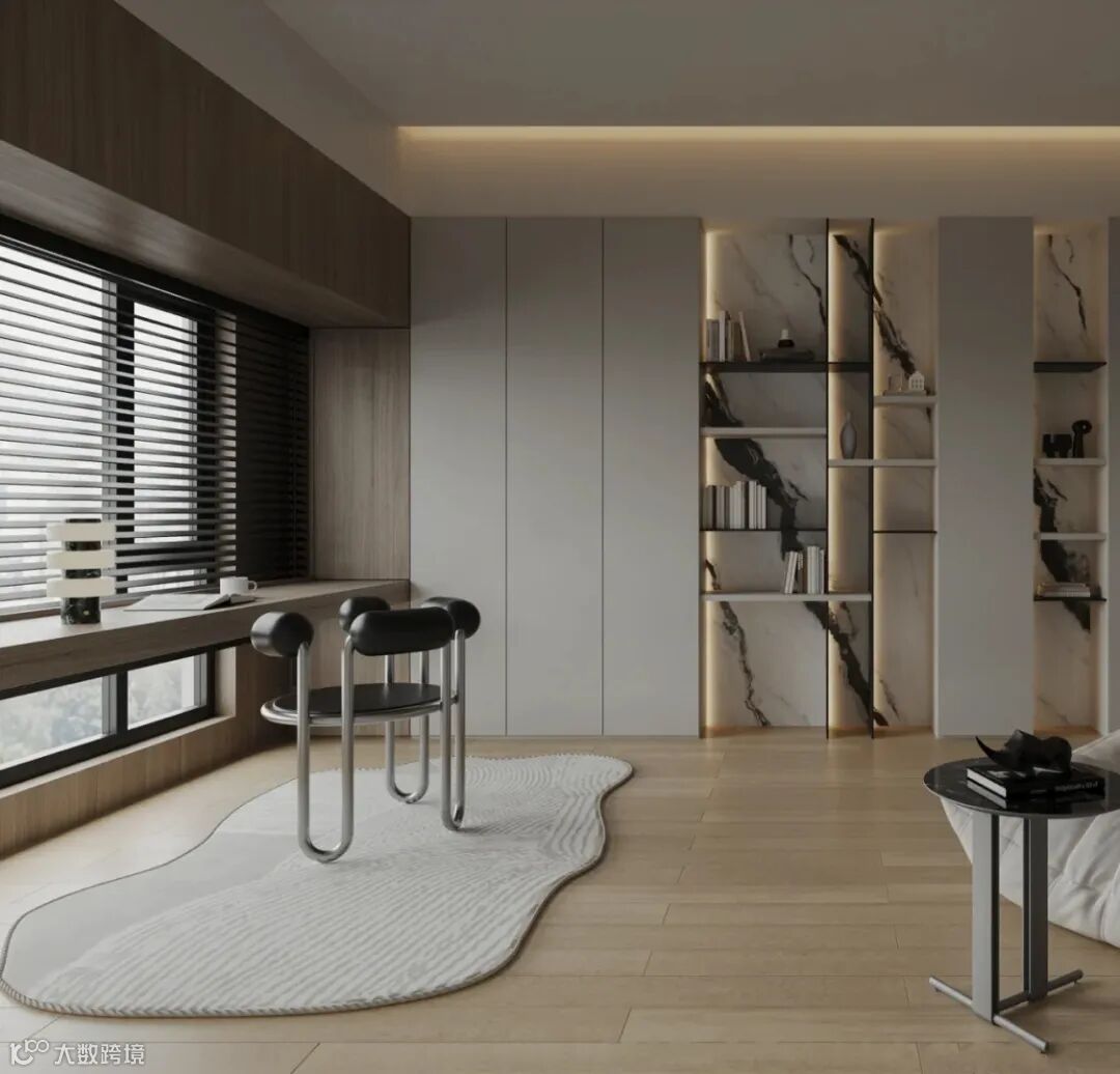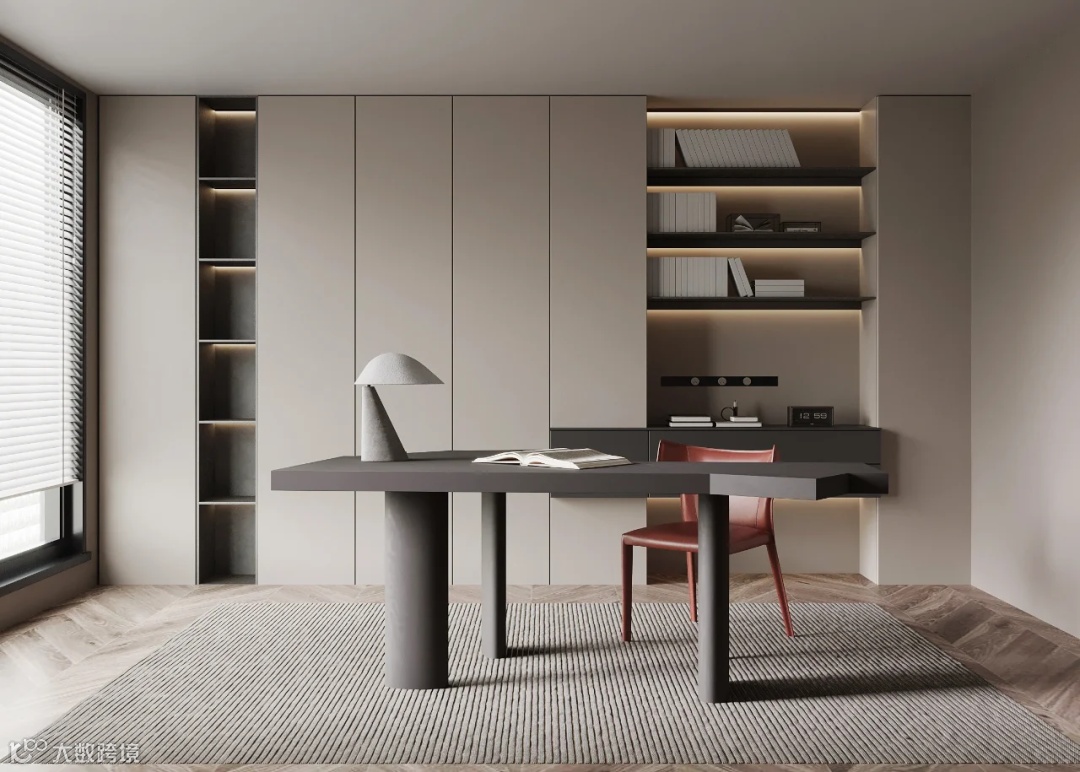 里侧靠窗打造悬浮书桌,视觉上更轻盈,窗前采用百叶帘隔断,满足采光需求,两侧分别打造通顶柜,封闭柜做收纳,另一侧则留出开放格放置书籍、摆件。