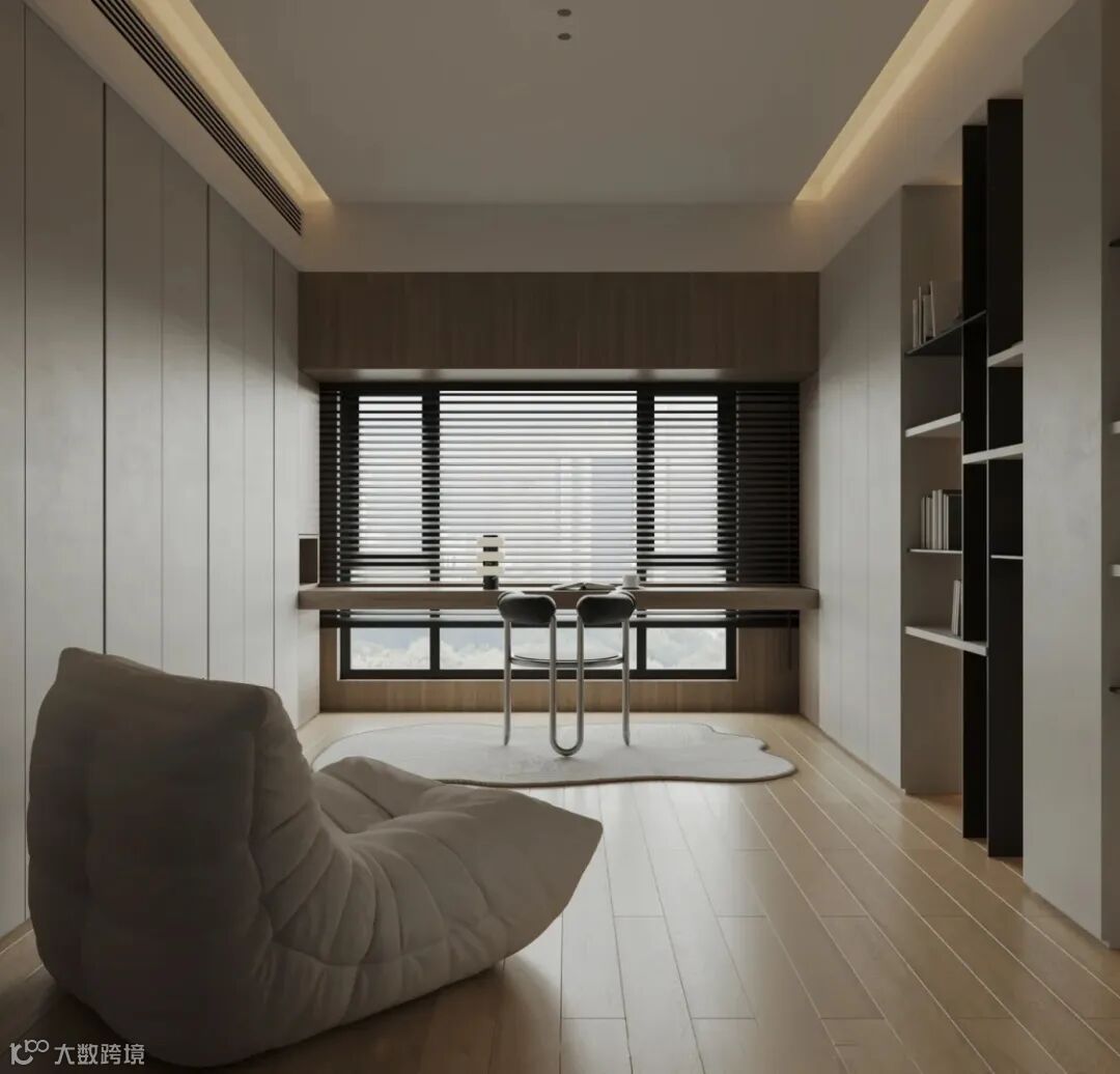 大面积的书柜设计,让空间收纳更充足。在这里,你可以尽情地书写、绘画、思考,让灵感在直角绽放,阳光透过窗户洒在木质地板上,为书房增添了一份宁静和祥和。