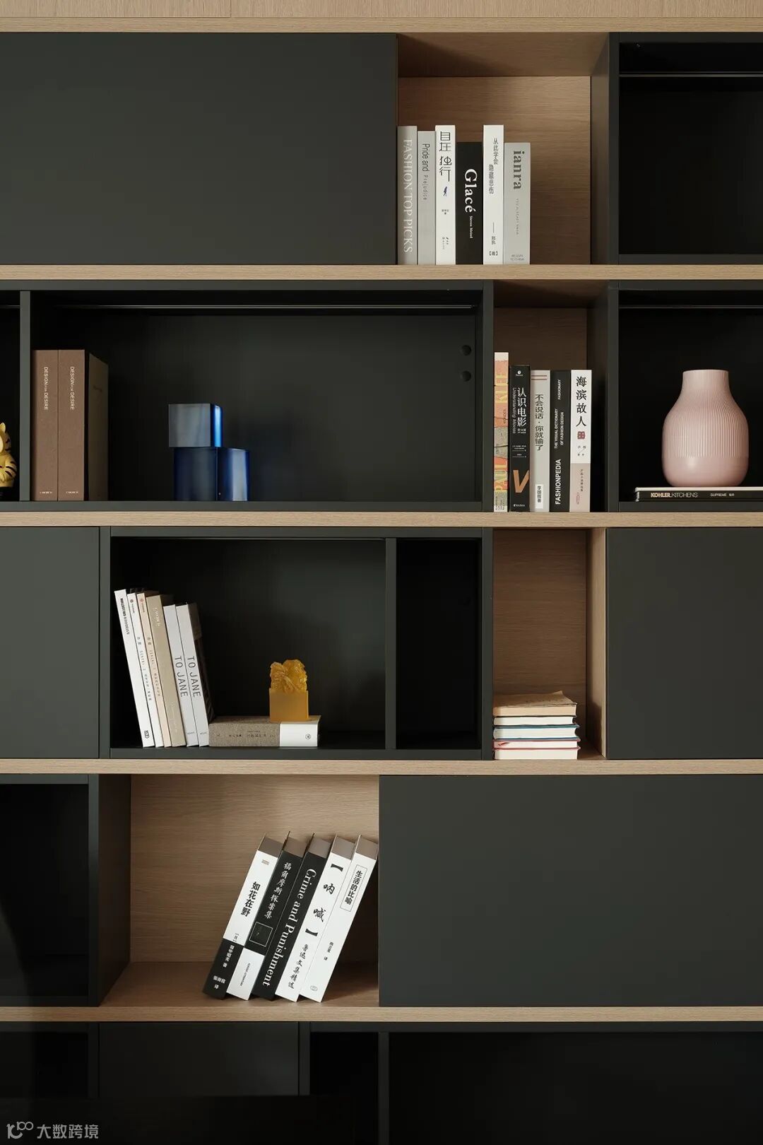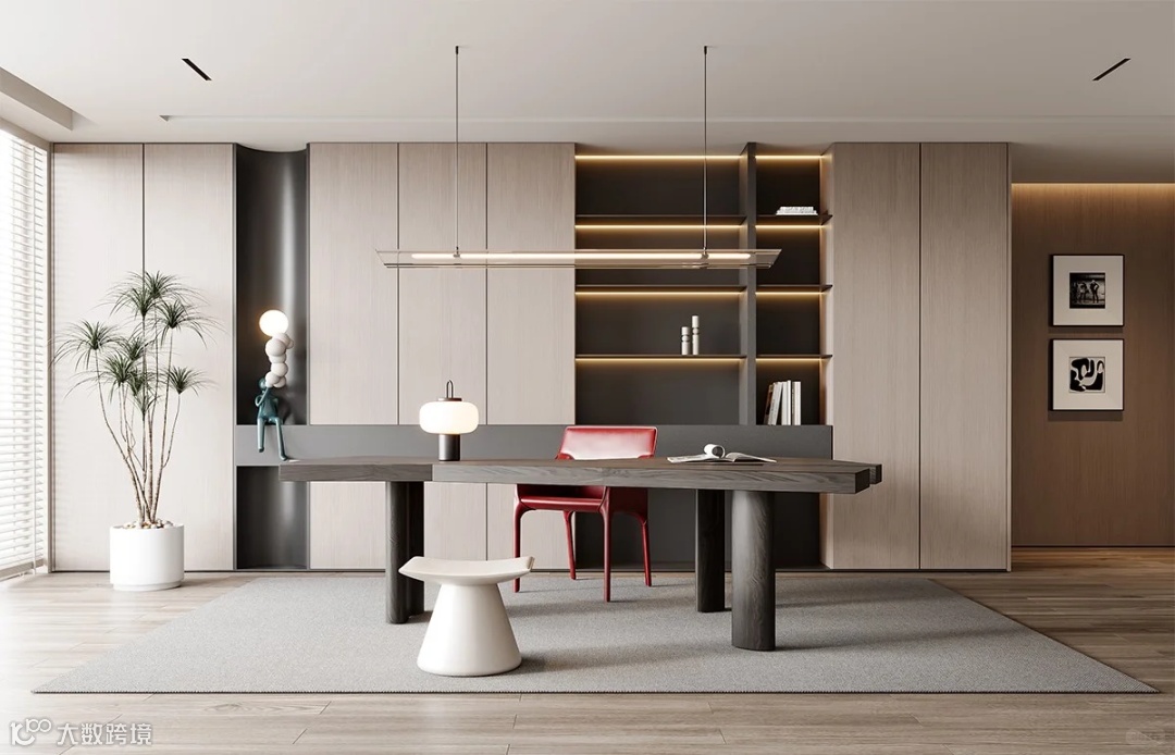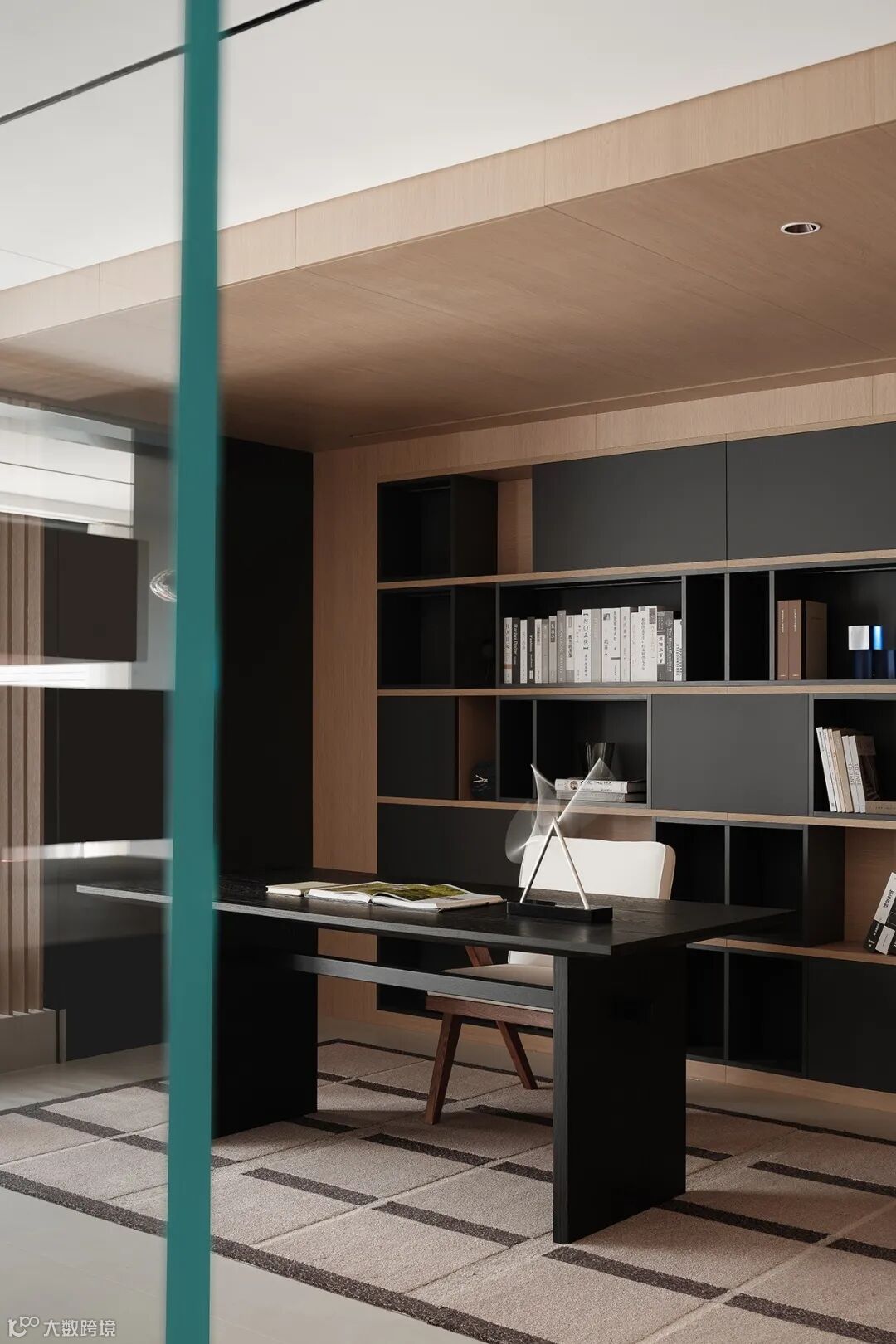 书房设计,大面积木色立面,释放出岁月静好的温润馨香,黑色体块的巧妙对撞,绘就现代艺术之韵。