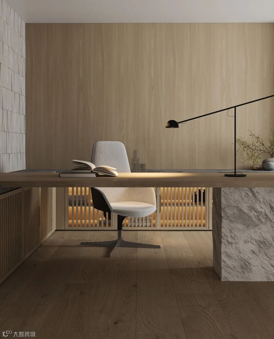 极简风书房,布局简单,色调清冷。整体采用简单的原木+灰白调,打造了一个干净简约的空间氛围,地面通铺木地板,营造温馨办公环境。