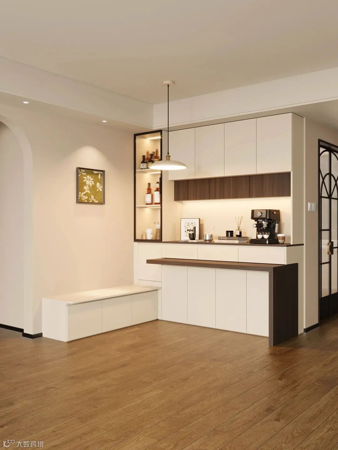弧形元素运用于餐边柜,成为空间的灵动点缀,增添柔和美感,整体配色简约大气,与家居风格巧妙融合,尽显优雅与温馨。