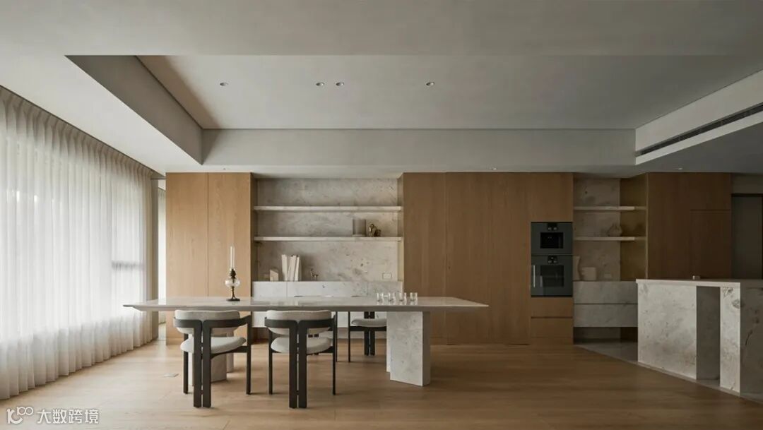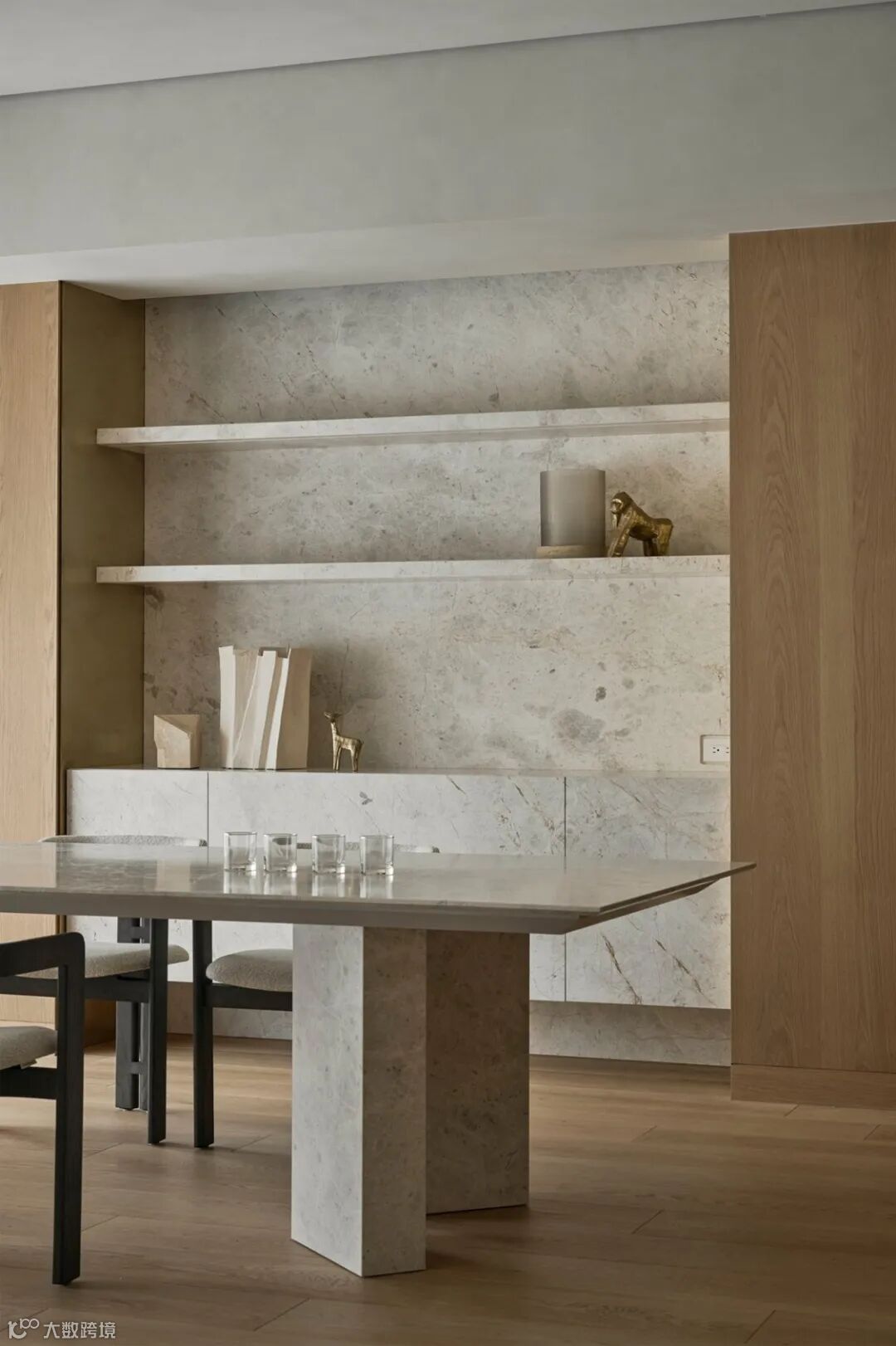 餐边柜,作为餐厅空间的优雅点缀,提升空间格调。浅木与石材的搭配,冷冽与暖意融合,中和了空间的材质疏离感。