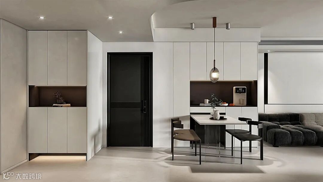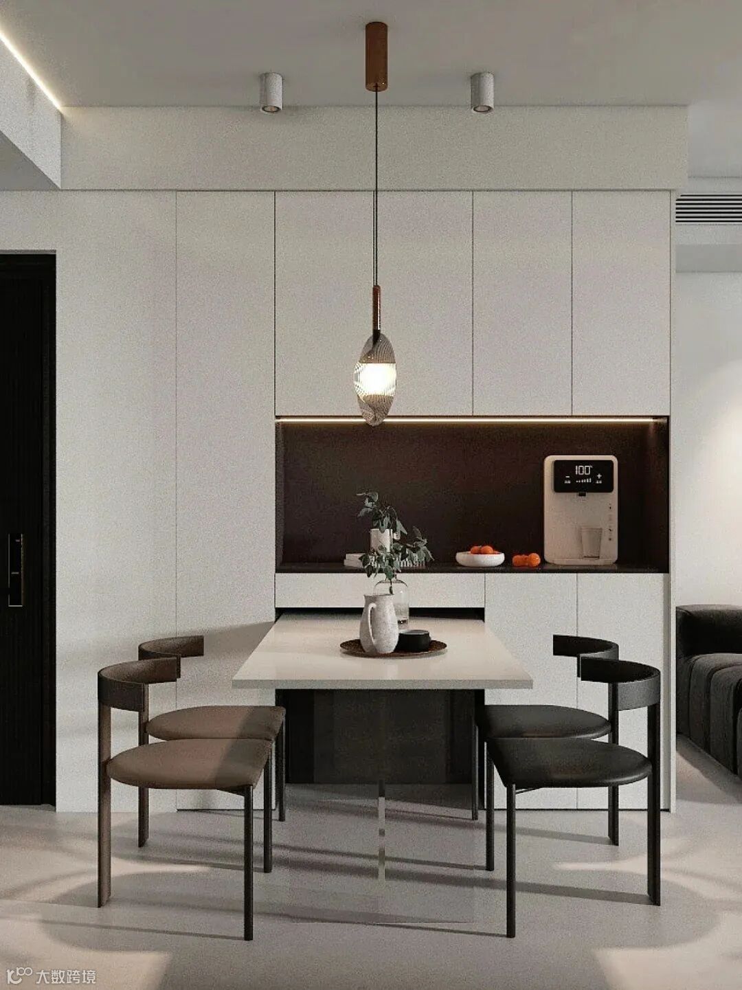 黑白是所有色彩的尽头,干净而纯粹。极简的餐边柜设计,让空间有了生活的气息。在空间中加入落地灯,装饰画,吊灯的金属元素,让素雅的空间有吸睛的亮点。