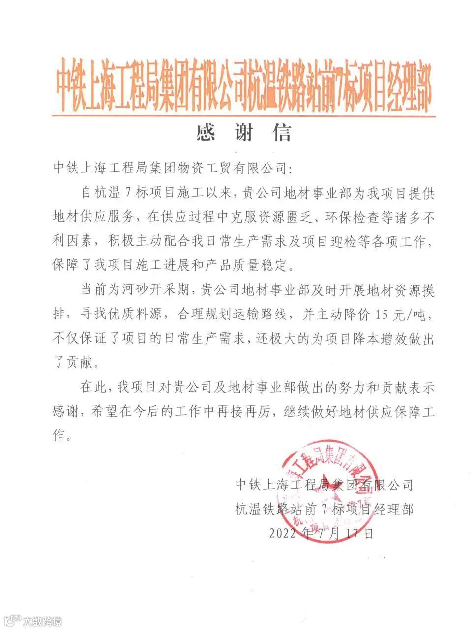 7月17日,杭温铁路站前7标项目经理部向公司发来感谢信,对公司在地材集采供应中做出的成绩表示肯定。