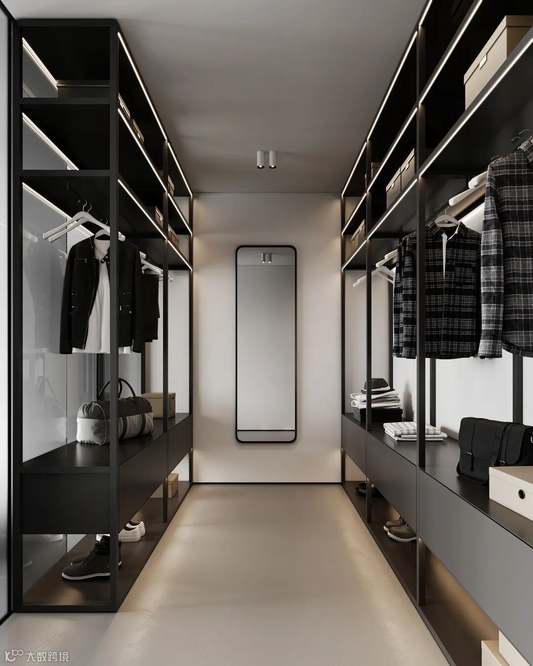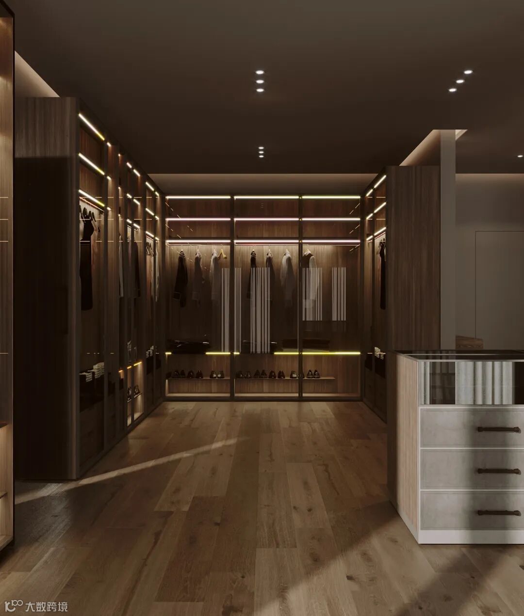 挂壁式衣帽间通过敞开式布局,以简洁的造型和完美的细节,打造出既简约又典雅,既高贵又不庸俗的设计。