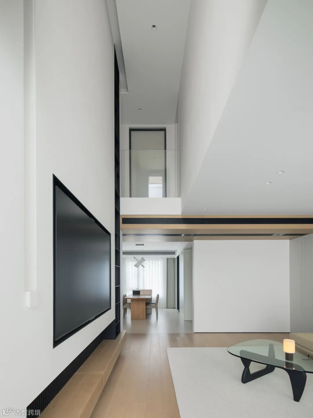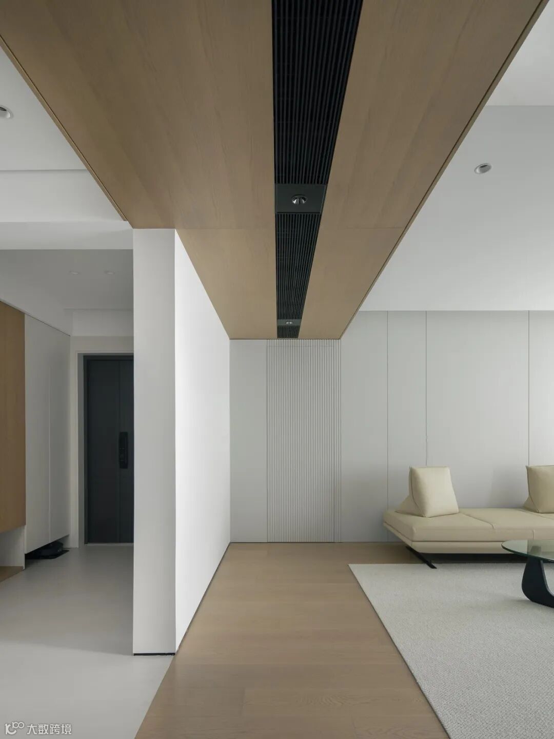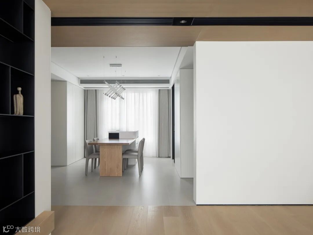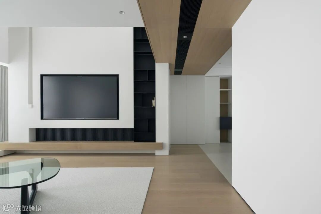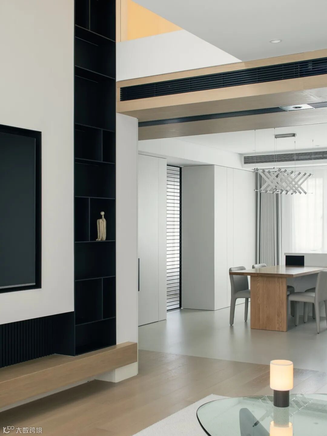 客厅原木搭配润白基底,汲取雅黑元素勾勒结构框架,材质、肌理、色泽互相嵌套,将内建筑的解构主义发挥得淋漓尽致,舒展空间序列。