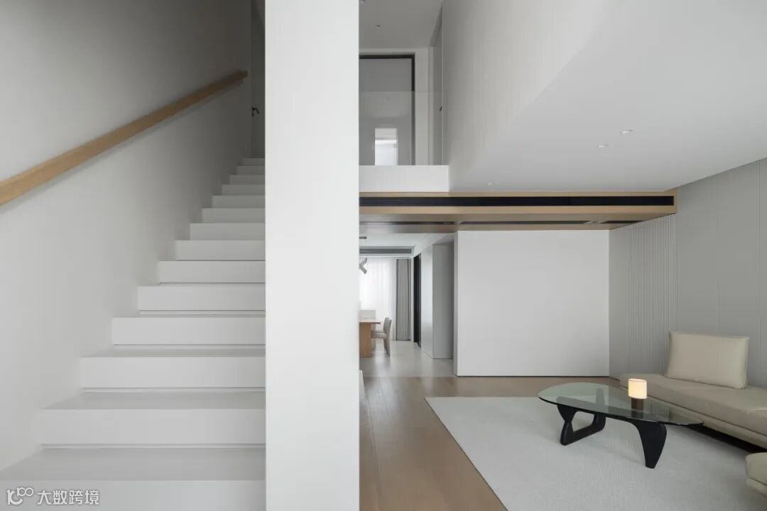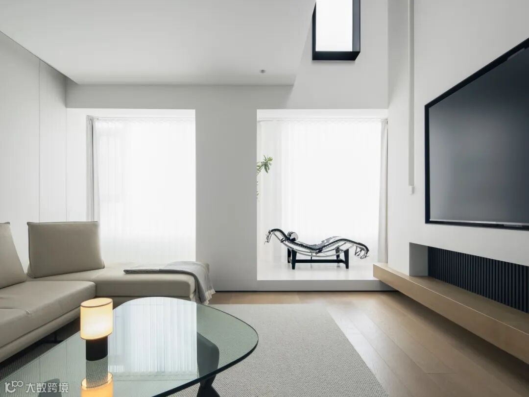 客厅呈围合式包裹,在低饱和的底色中置入同色系软装,为生活场域构建新的流动形态。