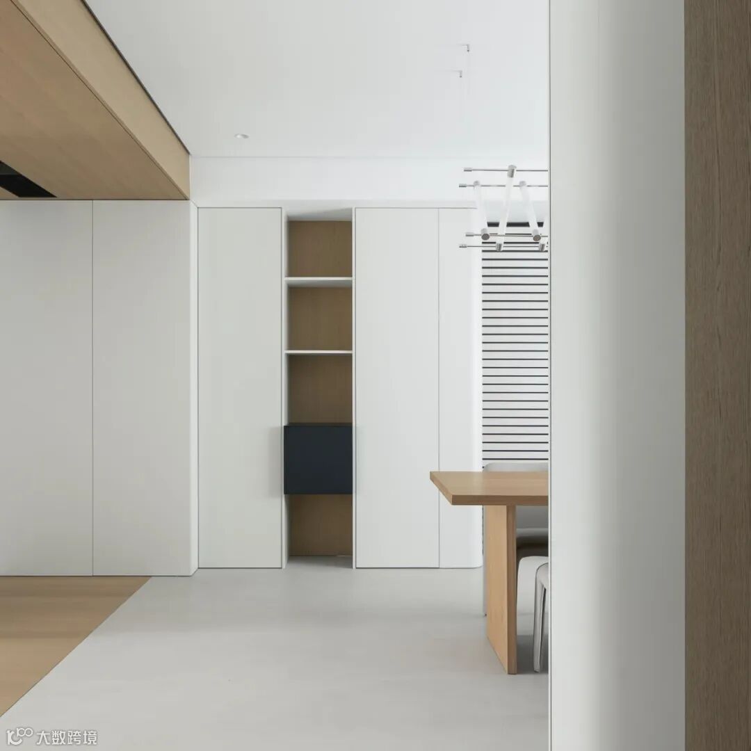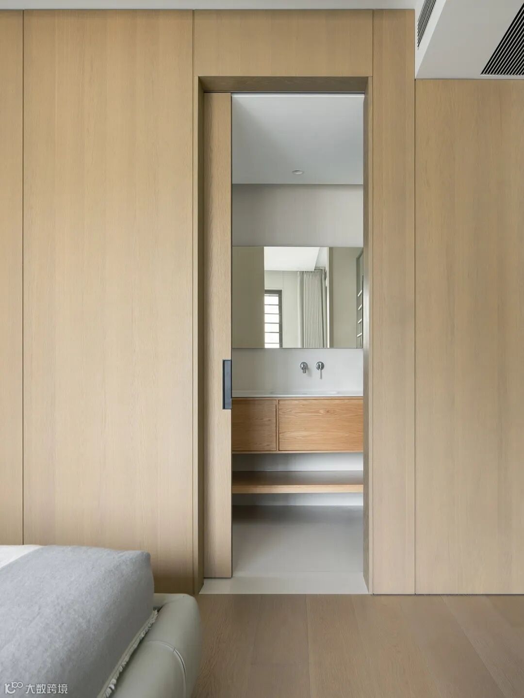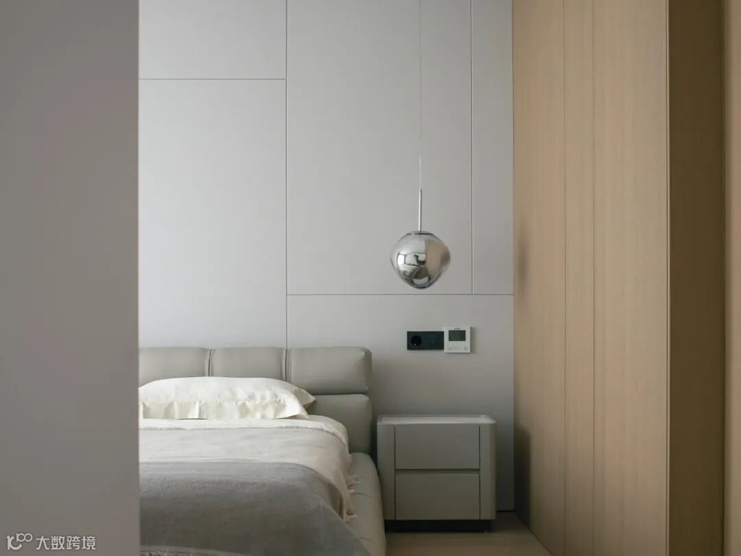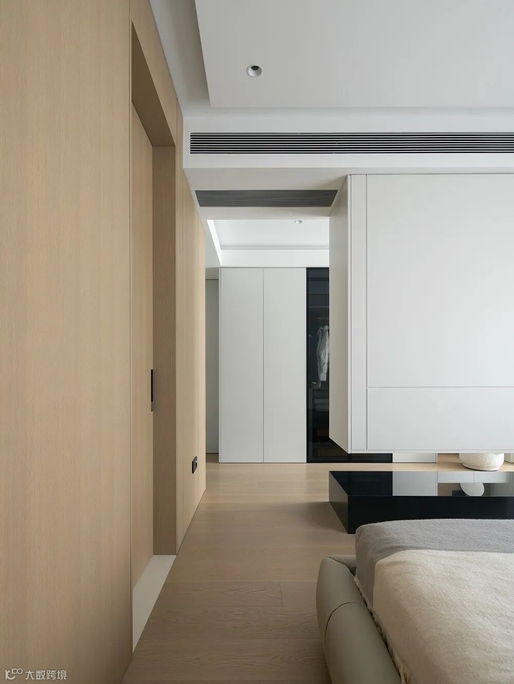 衣帽间的悬挂柜体作为区域过渡,将主卧分割处理,保持私密性的同时平衡着通透的空间感。
