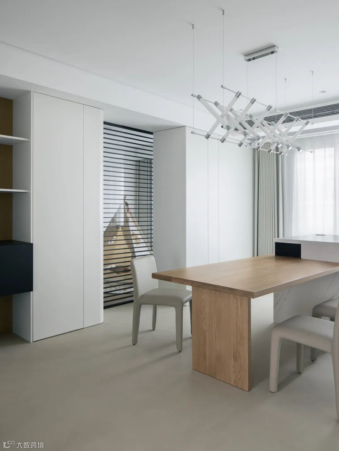 当视野后退,餐厅与客厅之间的交互愈发微妙灵动,管状艺术灯切换不同角度,在规则与不规则间赋予设计格调的平衡感,空间感官逐渐温柔、沉静,生活本味开始回归。