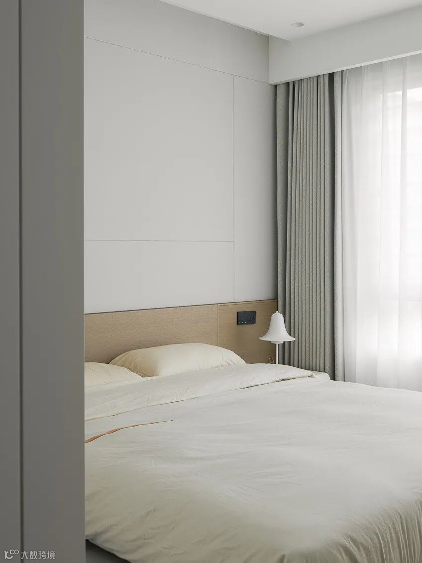 主卧延续低饱和搭配,以木色拼接简灰,舒展流畅线条,更强调材质本身的质感。在生活的微光点缀中,塑造轻盈温润的空间。