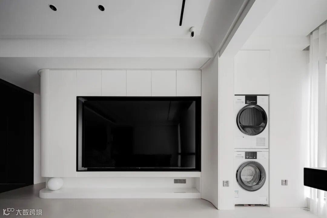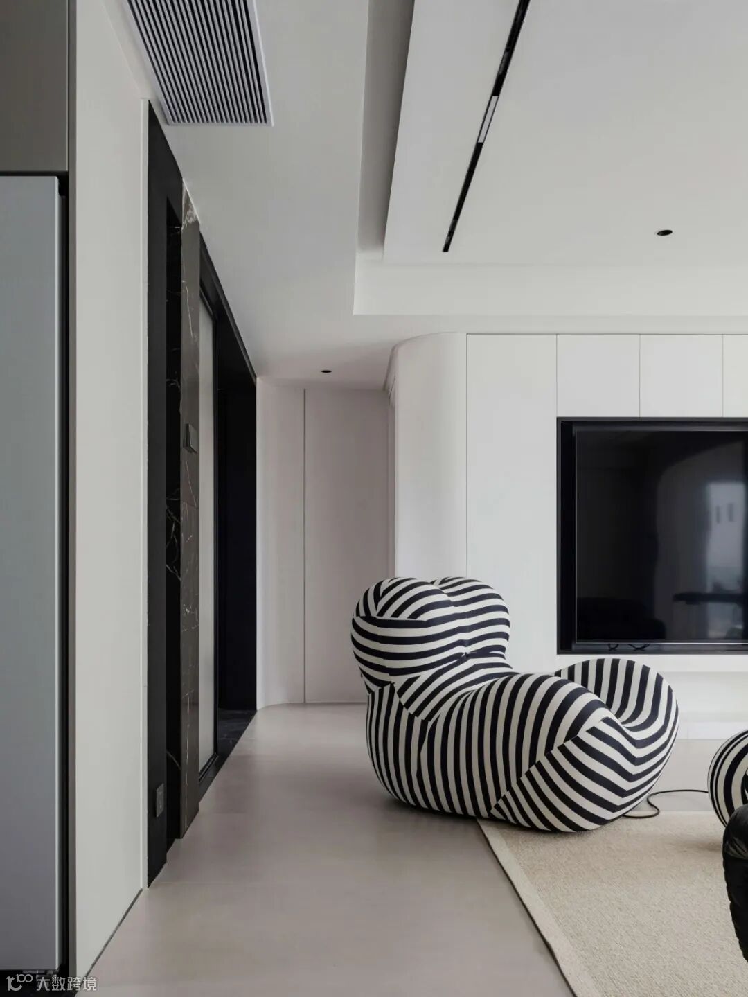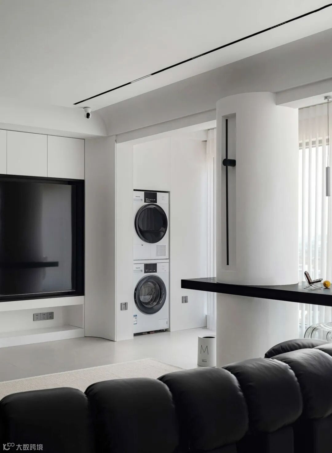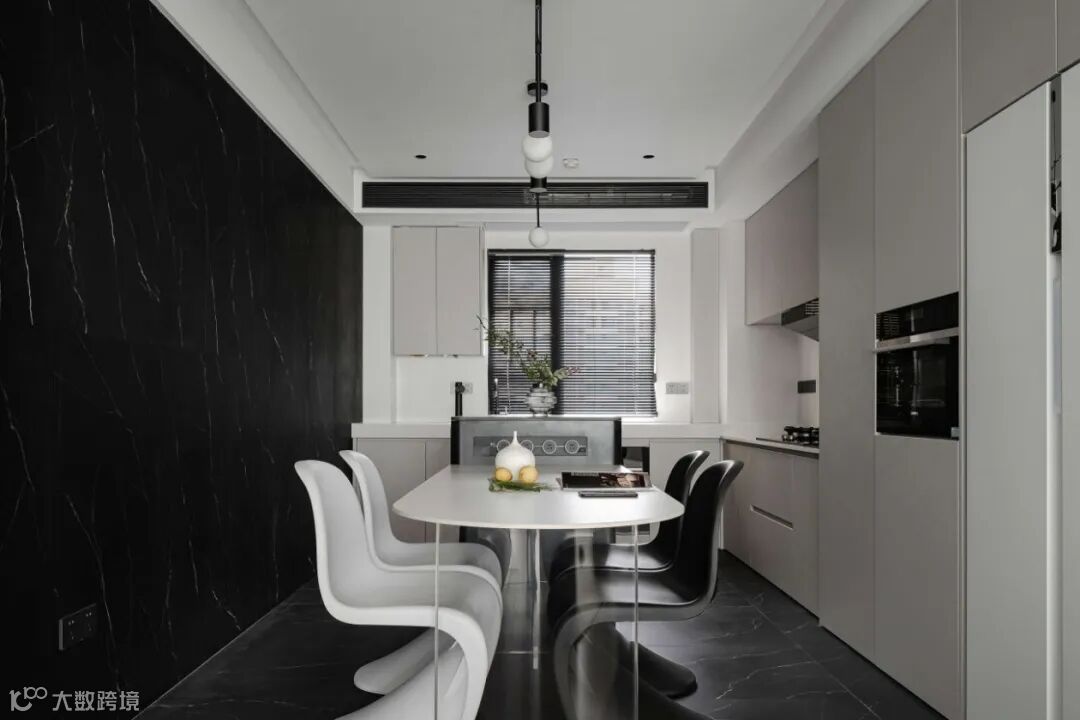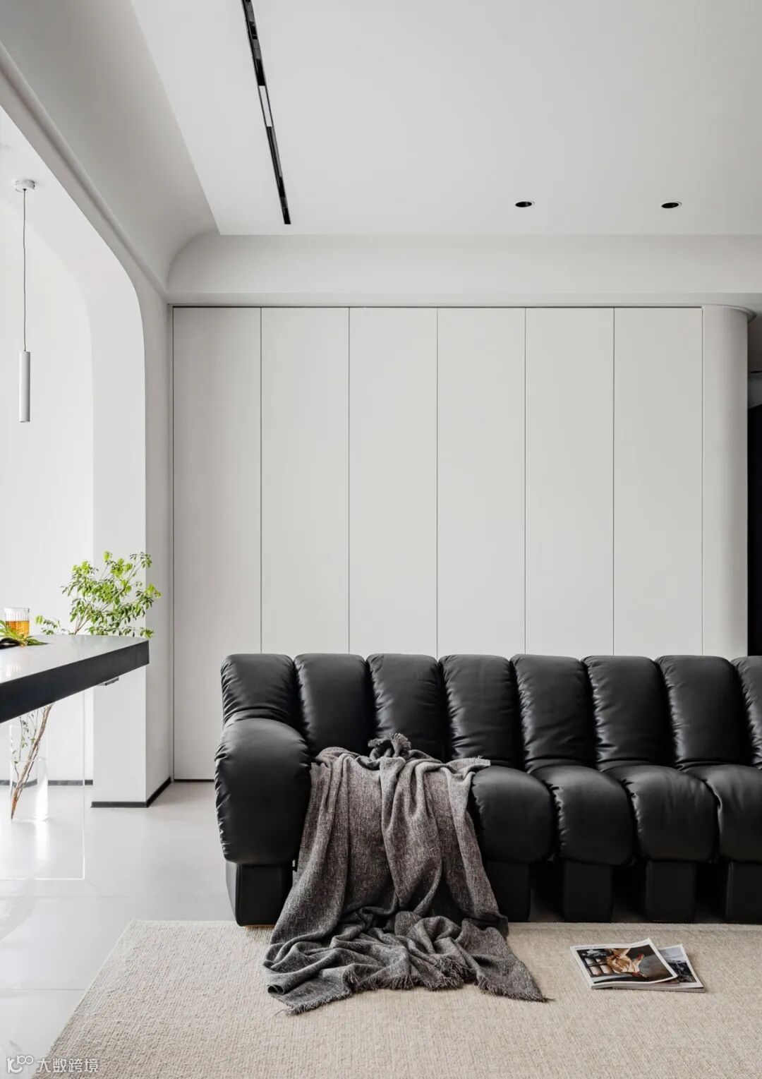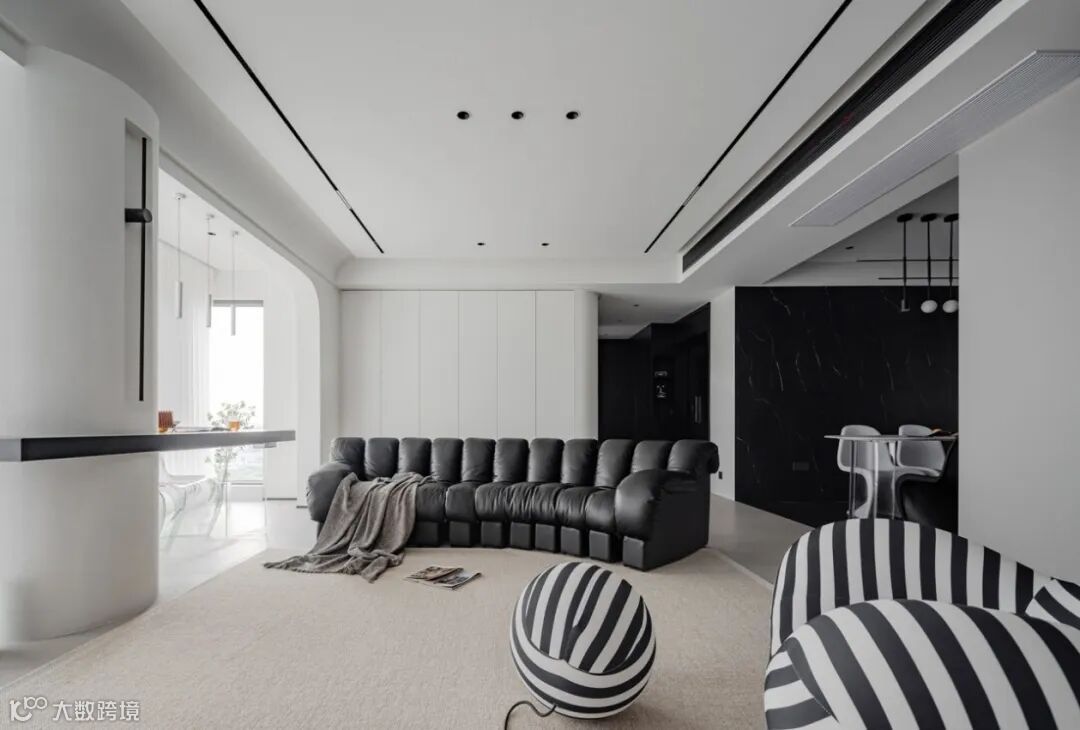 客厅空间只有黑白两色,但却又有柔和和清新。材质上采用硬朗干脆的黑色岩板与素白瓷砖,运用撞色,表达了空间的清晰区域界定。
