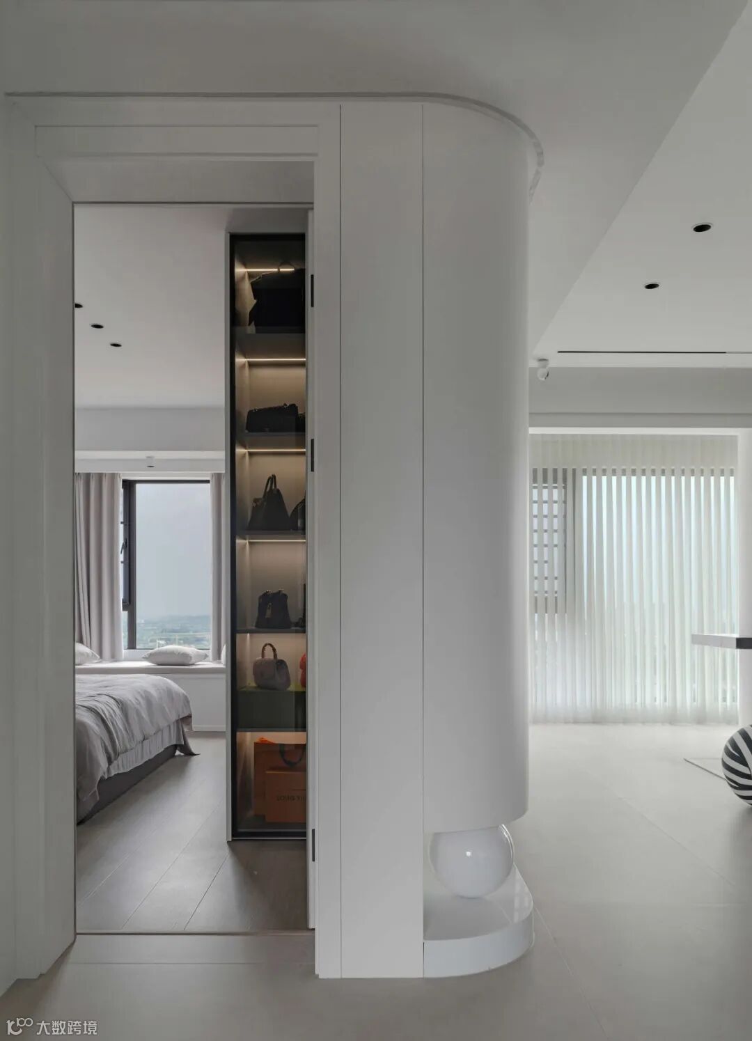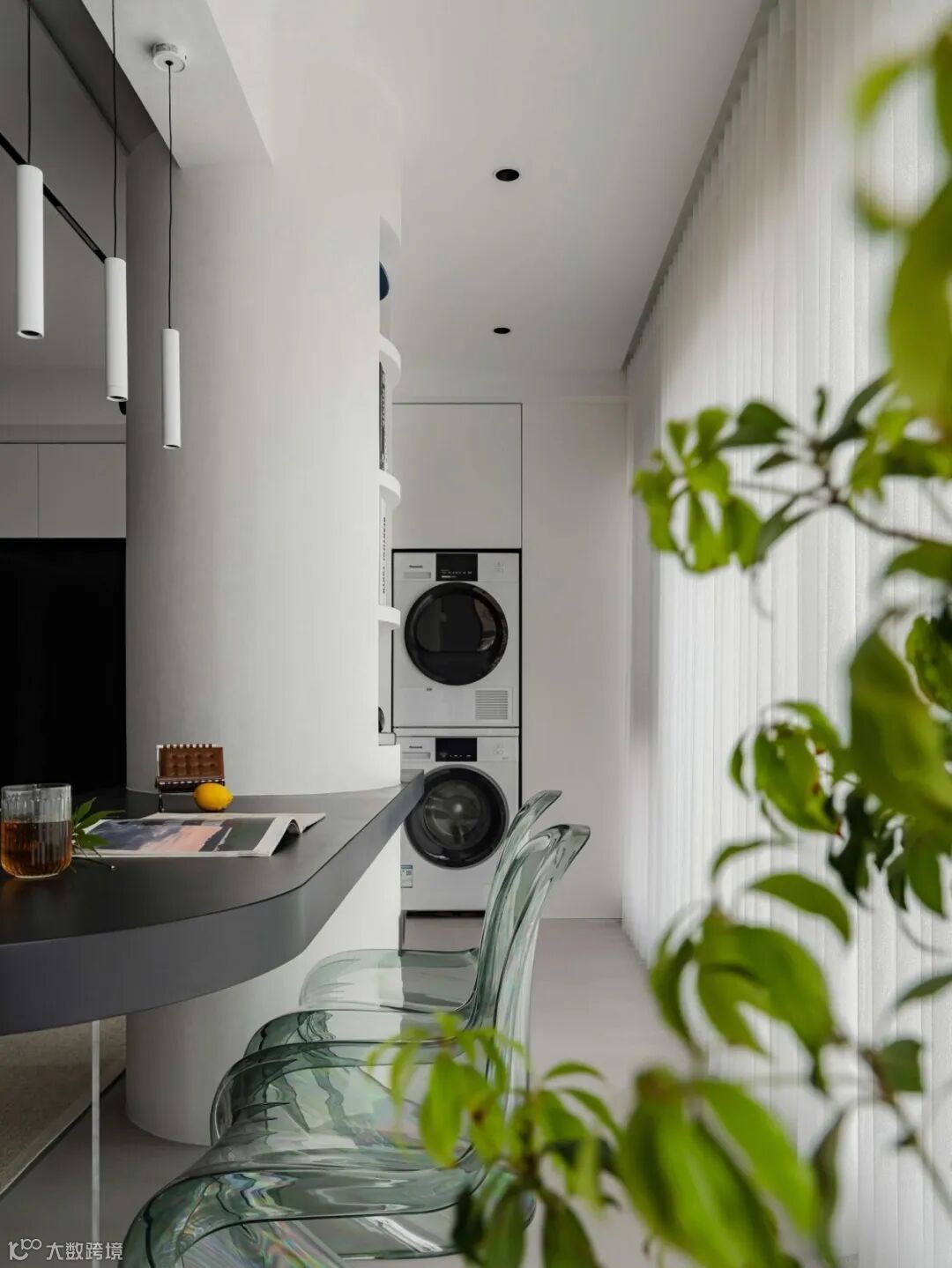 建筑中的公卫湿区正对客厅空间的,在盥洗区加一层具有艺术感的玻璃,不仅起到了隔挡作用,也让客厅形成了一个非常大气且通透的空间同时还增加了空间艺术感。