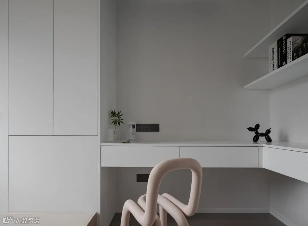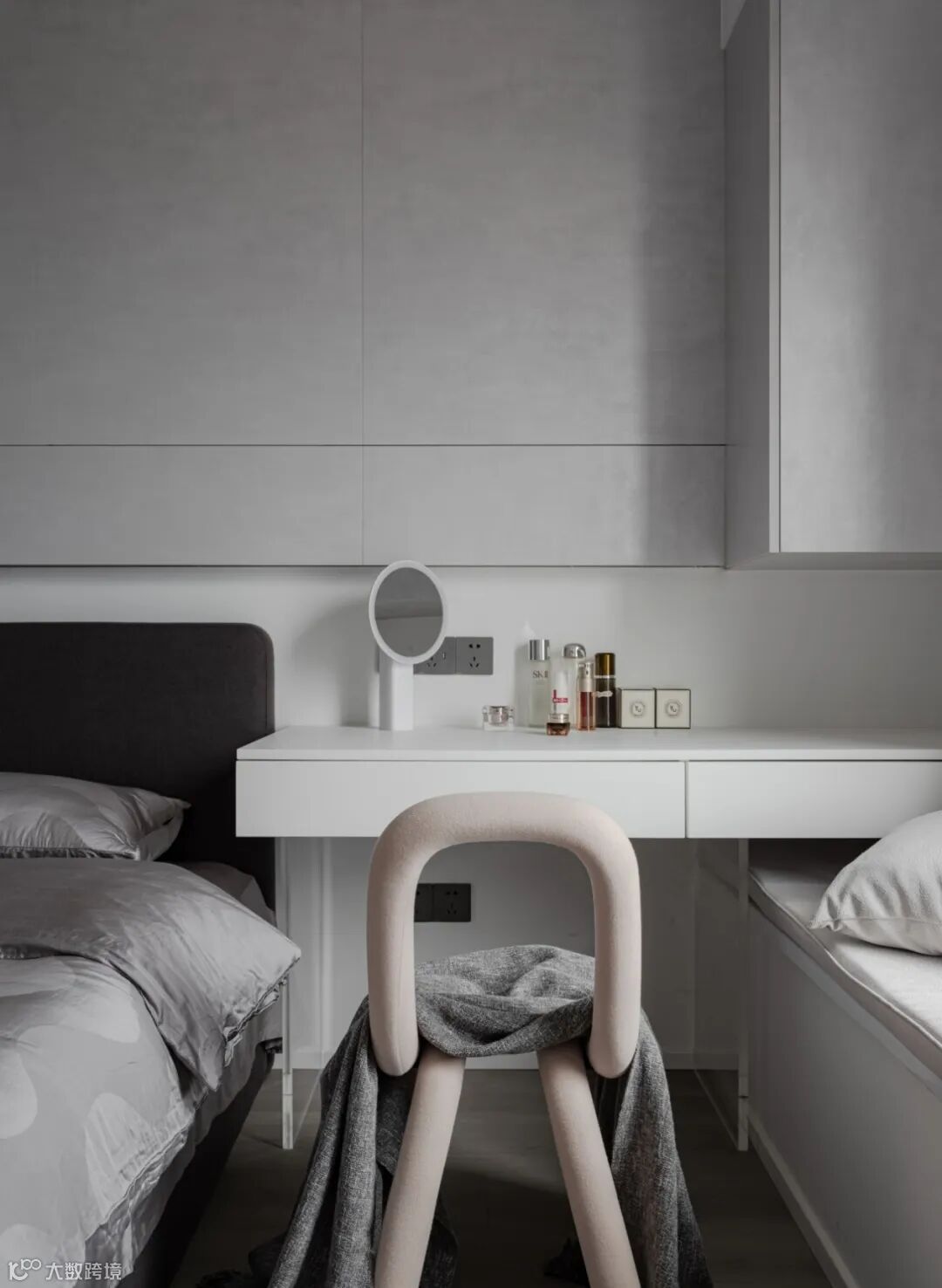 大面积采用浅色,不仅耐看,也能让空间显得更加宽敞。同时梳妆台连着飘窗,自带设计感的粉色凳子,更是为空间增添几分趣味和艺术感。