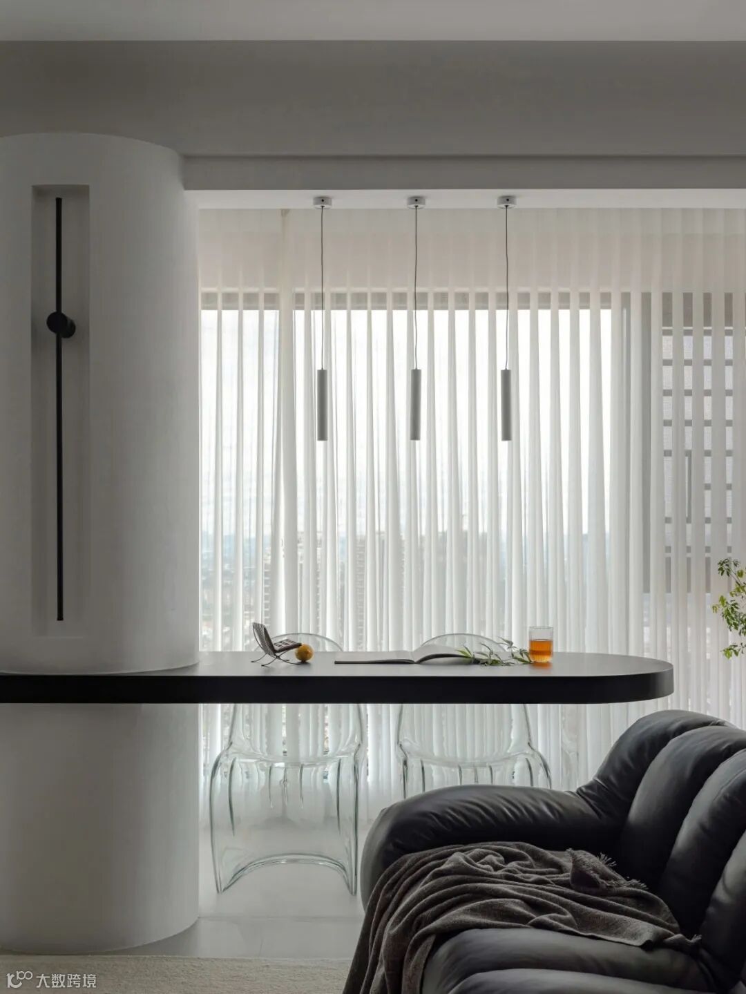 阳台作为室内空间的延伸,开放式下设计了休闲区,整体以简洁自然为主,桌子连接柱子,造就悬浮的视觉感,成为客厅的一抹亮眼的地方。在此,可以喝茶看书,放松心灵。