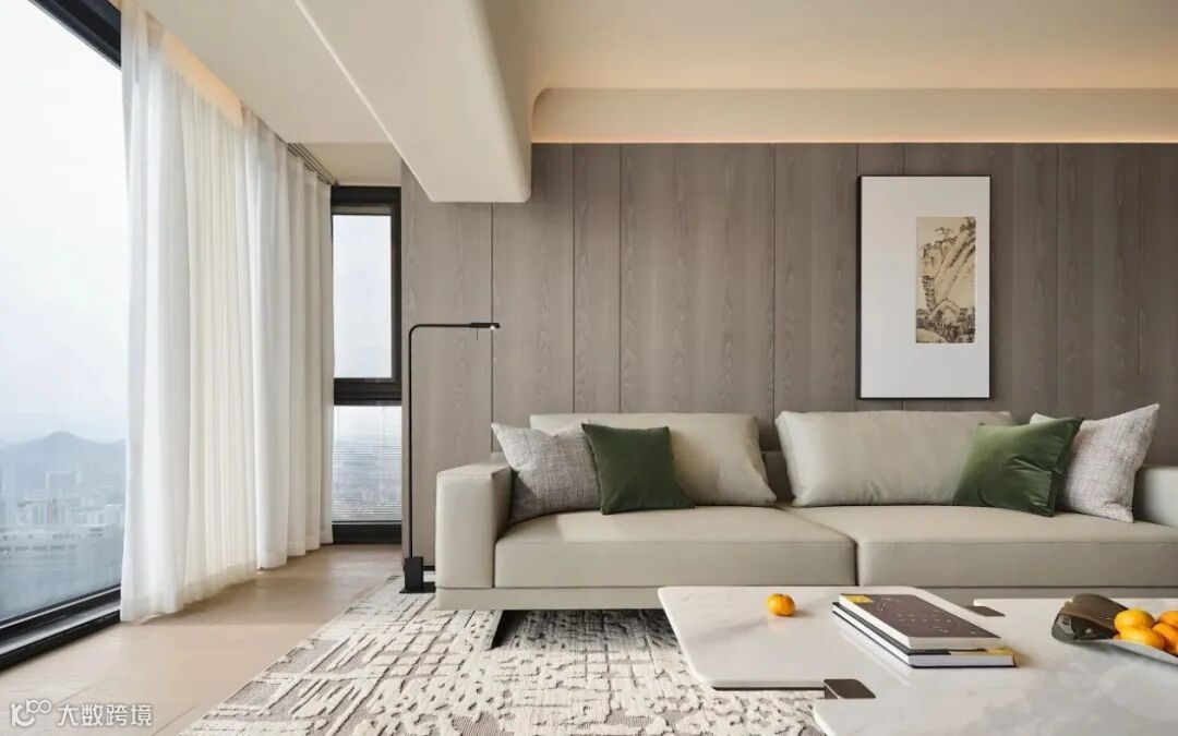 客厅沙发正对着落地窗,采光性极佳,背景墙温润的质地,搭配沙发灵动的形态,兼具美学与功能,增添一株绿植,让空间更有自然的气息。