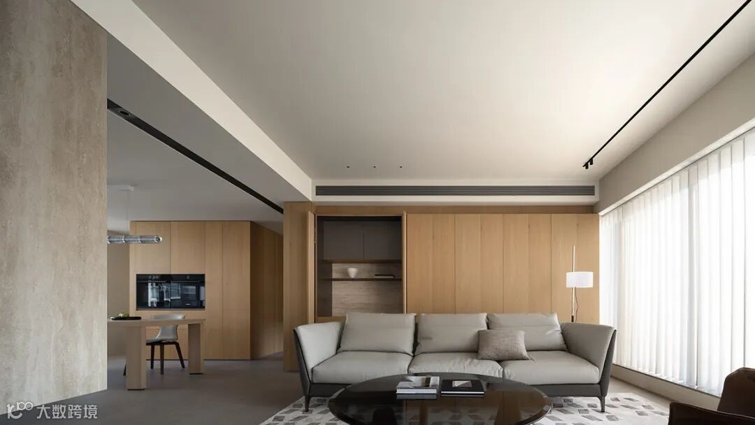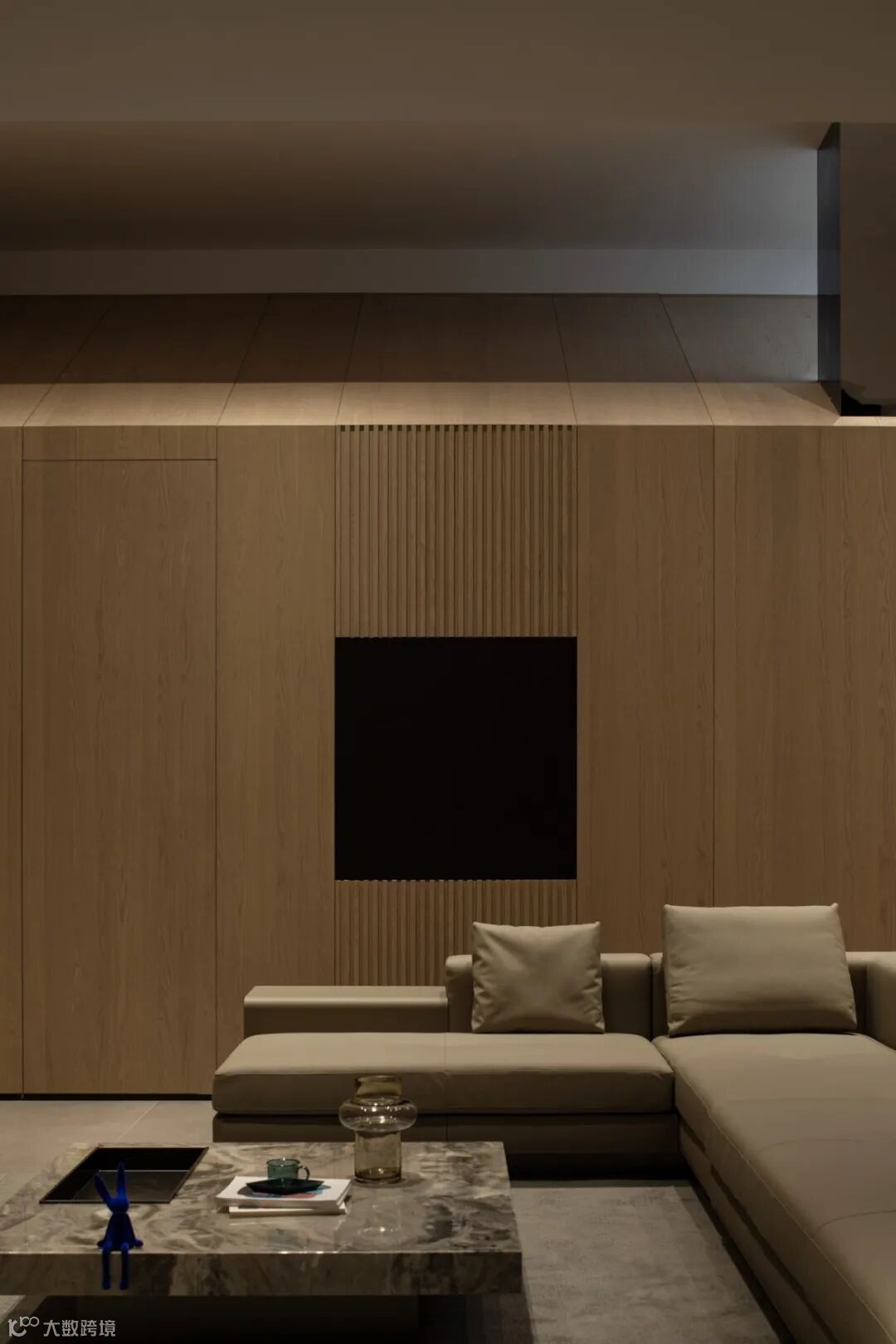 客厅大面积的落地窗,搭配原木背景墙的自然风,当自然、光影与空间产生联结,形成柔和而复杂的材料和颜色,室内功能几乎就融于环境之中。