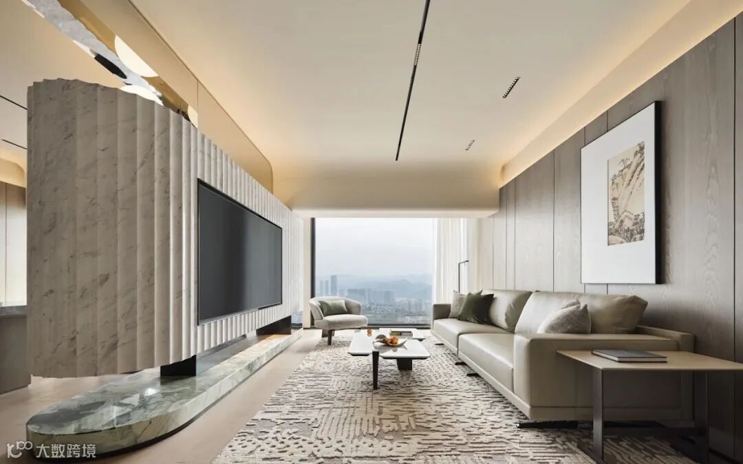 弧形电视背景墙搭配客厅整体的材质和色调,形成视觉焦点,增添了几分艺术感,在满足功能性和整体性的同时,还兼具精致美感。