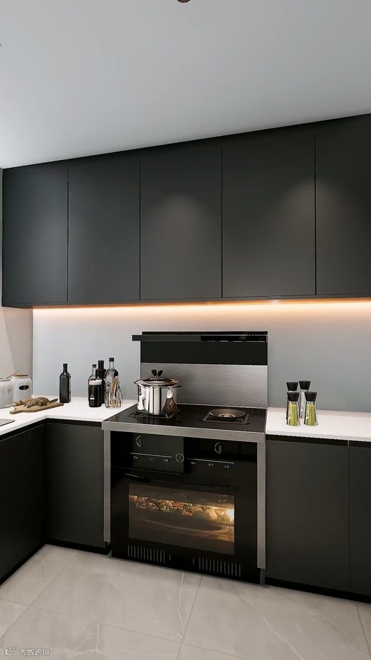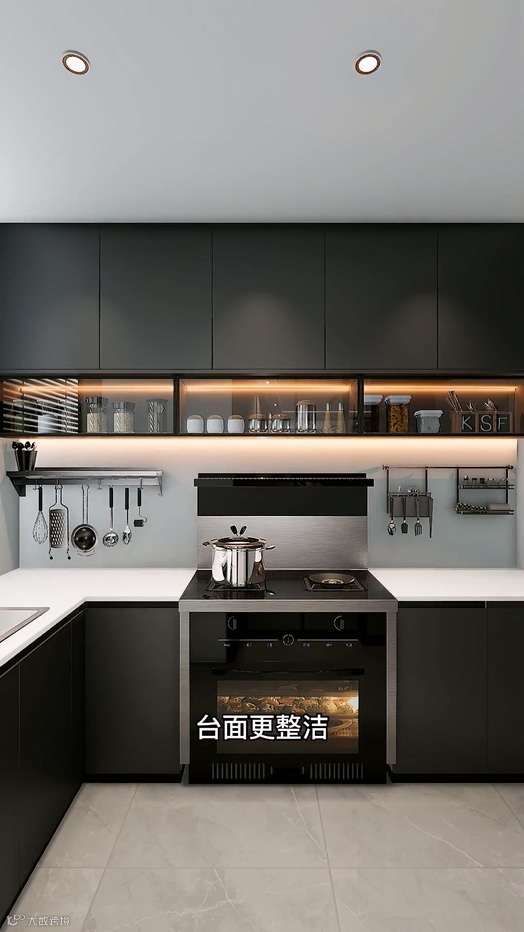 First of all, shorten the top cabinet and design the bottom cabinet, can put all kinds of bottles and cans of spices into the inside, and then install metal shelves and baskets on the wall, so that the table is more clean, cooking is also easier.