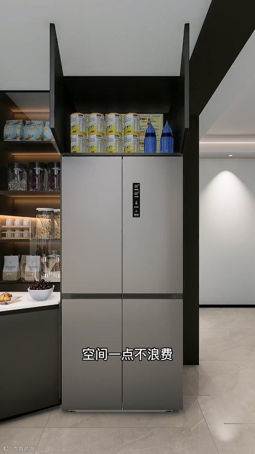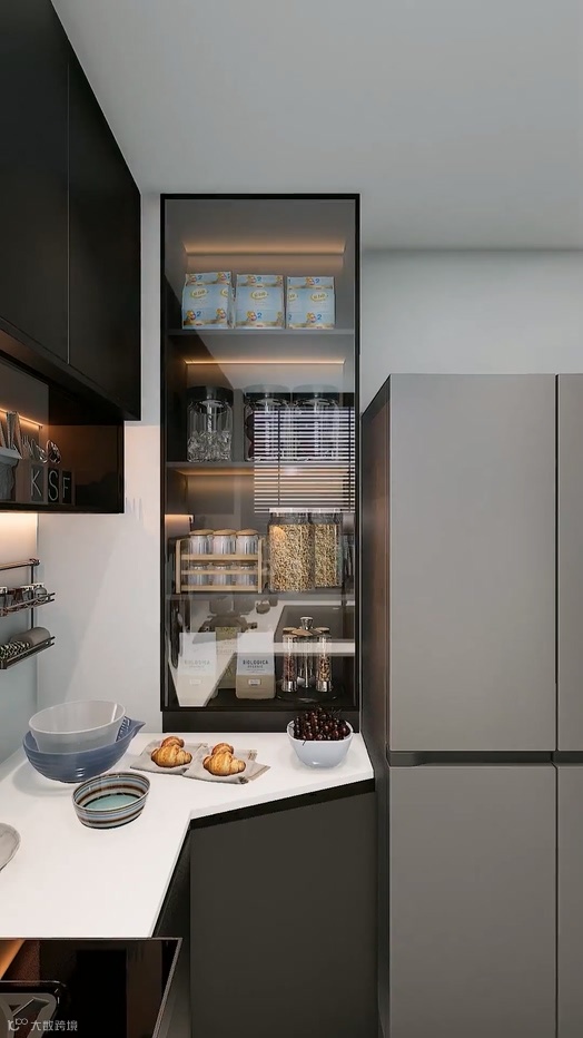 Then, instead of making a traditional cabinet in the corner, he would first move the refrigerator to the right and design a diamond cabinet. The items stored in the cabinet were easy to pick up at a glance. The counter top was also extremely spacious, allowing more space for things to be stored. Flue design low cabinet, north and south dry goods are all placed inside, the installation of transparent cabinet doors, goods easy to take and put, beautiful not fall ash. Then the top of the refrigerator to do high cabinets, increase storage space, space is not wasted.