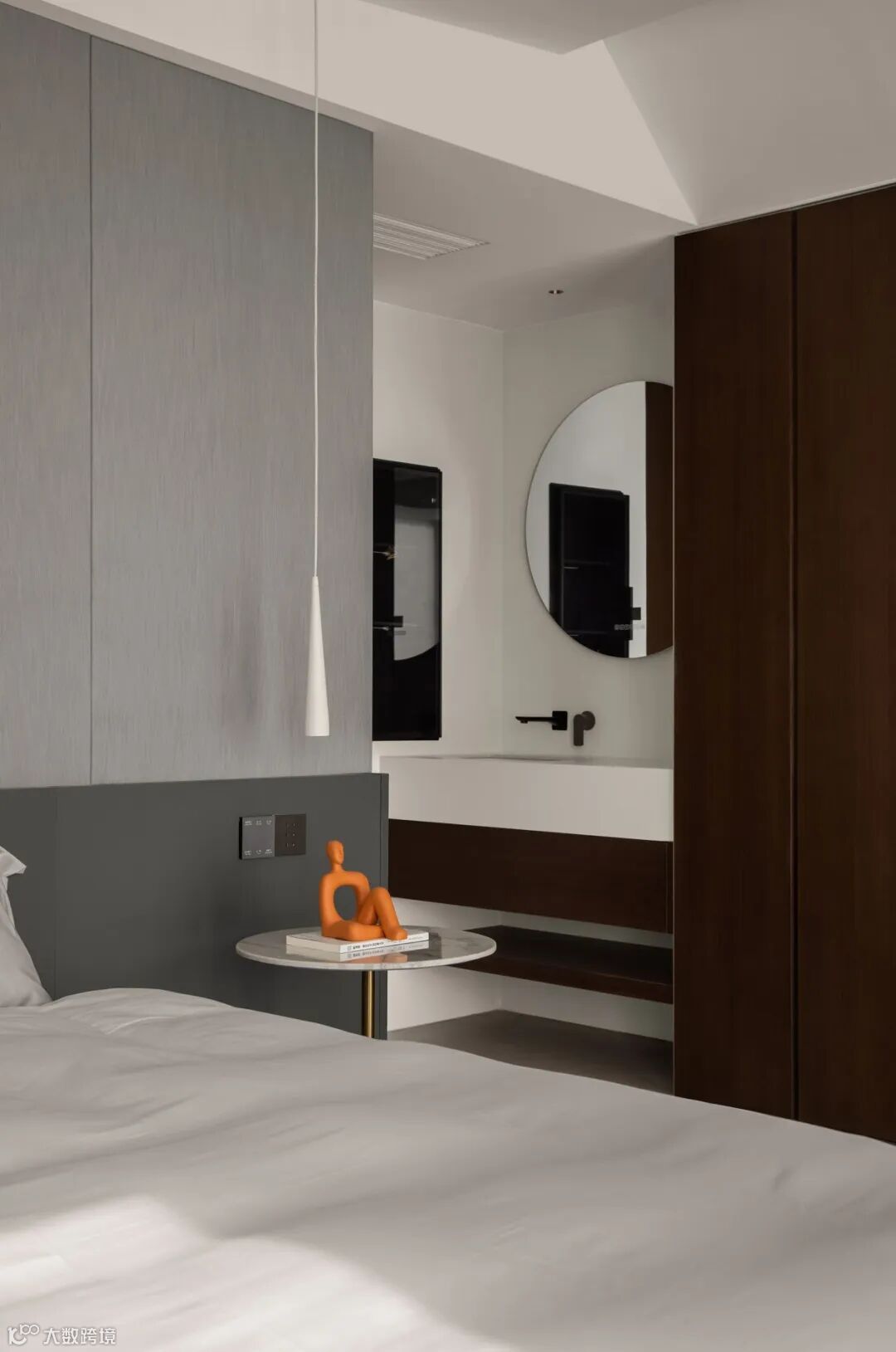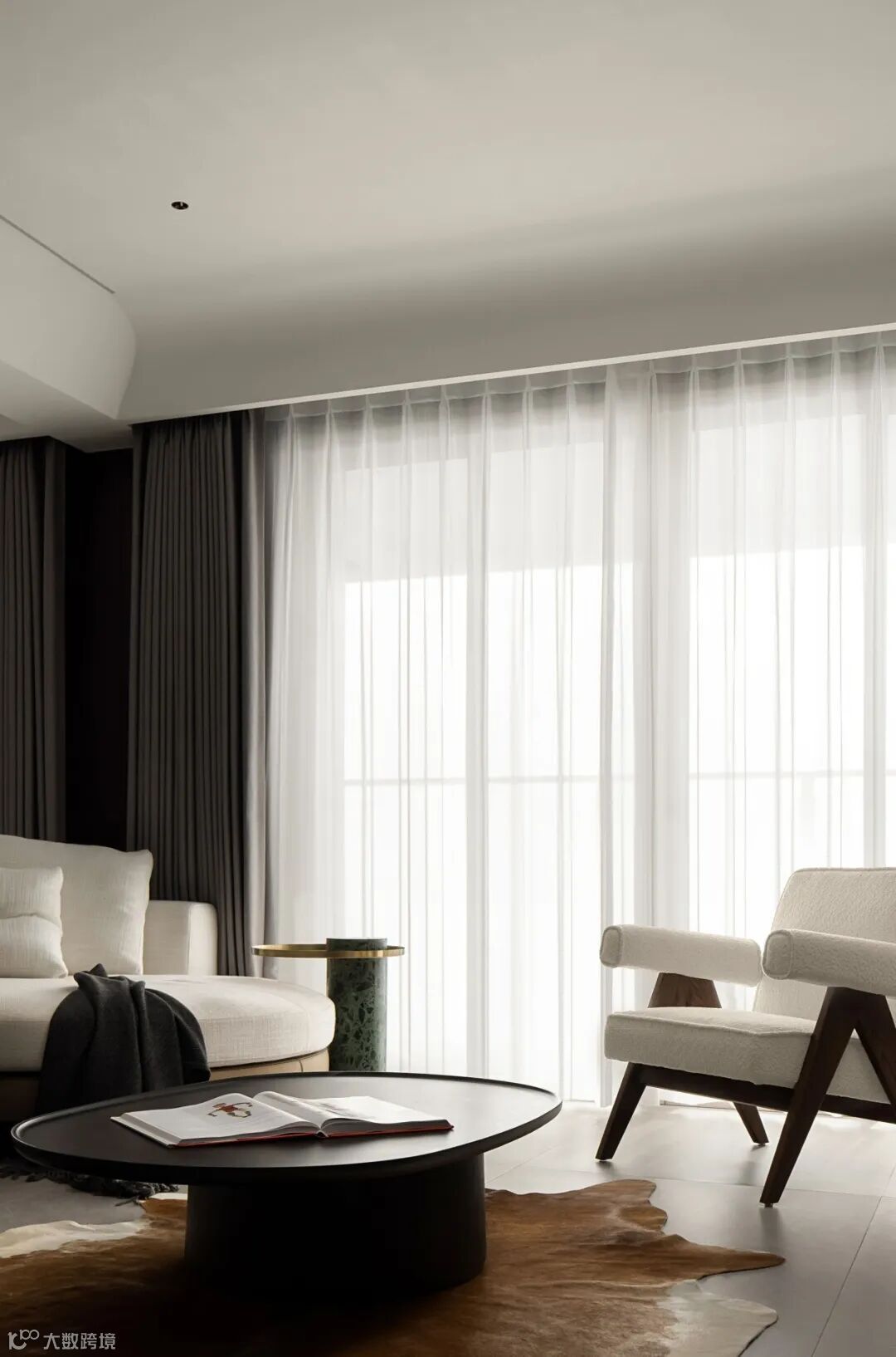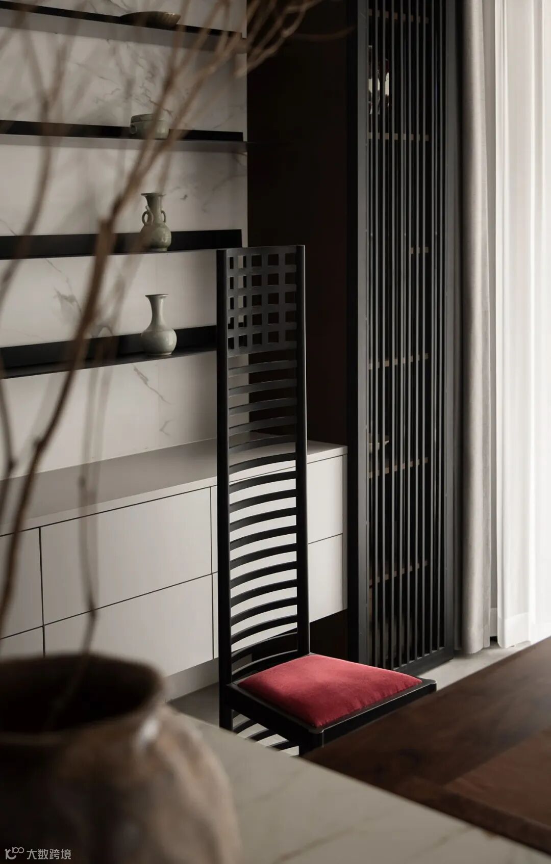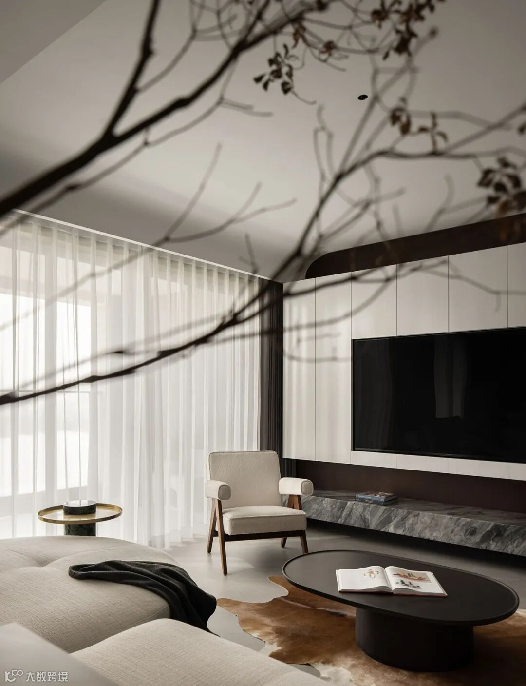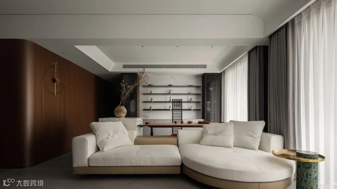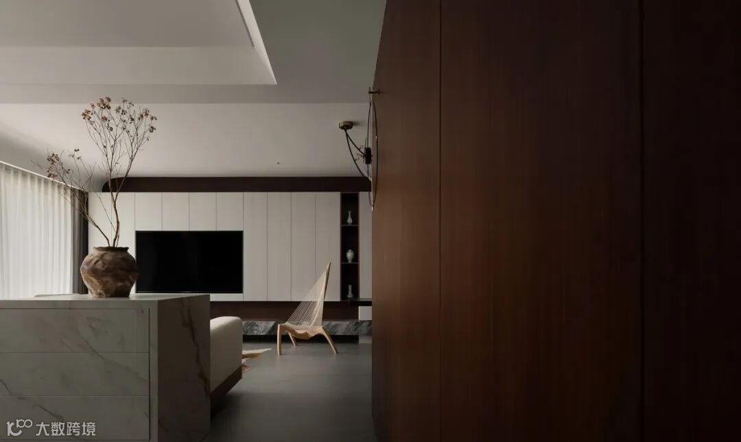 立面转折之际,激发出重轻相间的视觉张力,构建悬空形态,平衡由重量感,同时结合大理石、皮质、布艺等材质,将色彩温度、错落美学、点睛装饰逐次共和,树立起会客场域的气度与韵味。