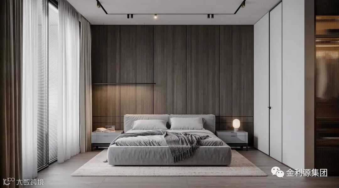 主卧设计,纯粹、自然、舒适惬意,木制结构糅合进简净的空间,床头以木块组合排布的形式作为背景装饰,布满了温馨的原木纹理。