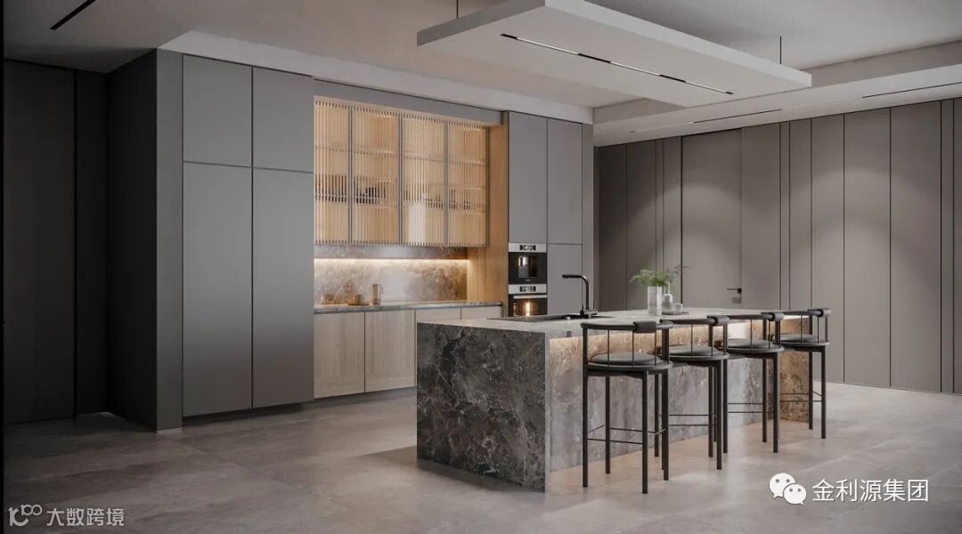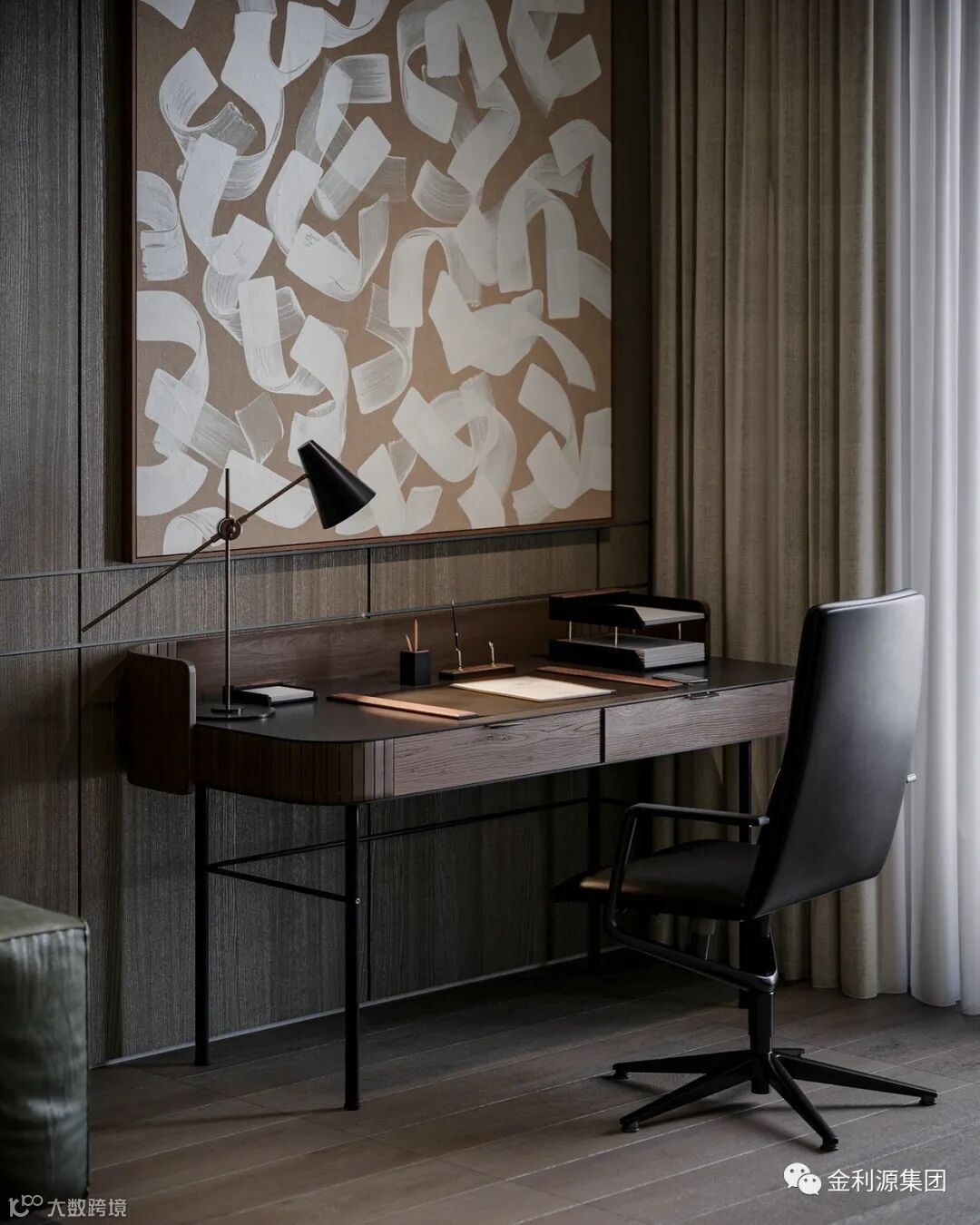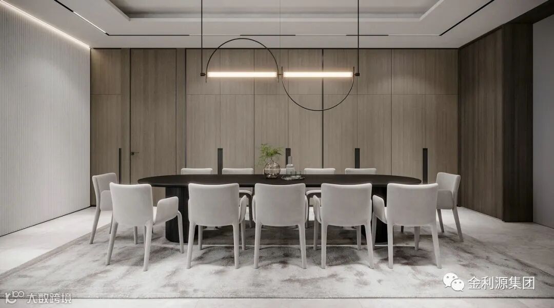原木饰面在其中与之搭配加强空间层次感。经抛光的木材泛起淡淡的光泽高级而有质感,家具的柔美曲线结合独特的设计如同一件独立的艺术品,形式与功能完美结合到生活。
