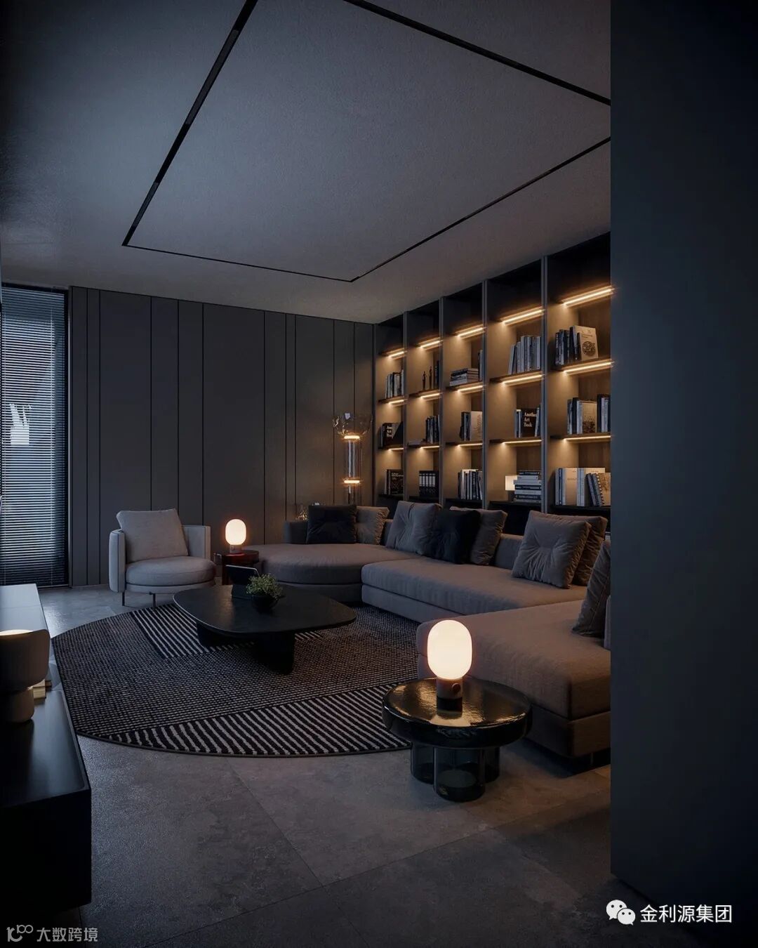 经典的黑白灰配色搭配原木材质,营造质朴且纯粹的空间氛围。灰色的布艺沙发搭配哑光黑色茶几,造型极简却不失细节。严谨的结构设计方式让空间变得井井有条,原木书柜与整体空间融合,细腻的纹理更显空间的精致。