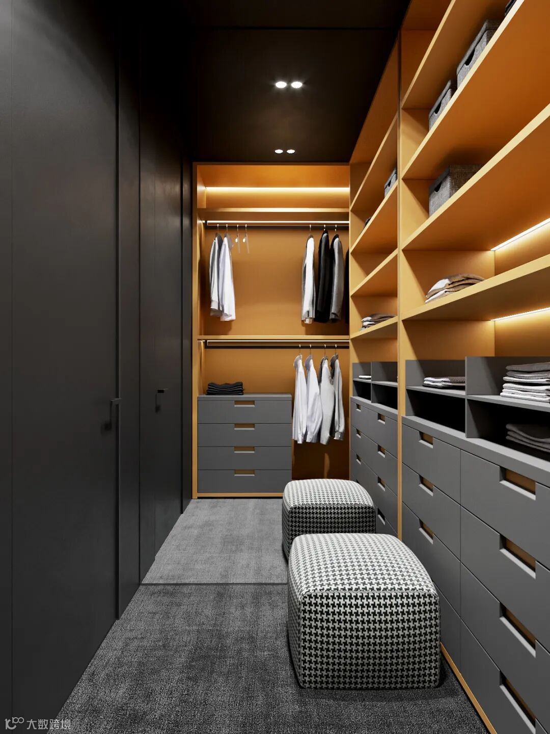 L型衣帽间具有较大的储物功能与实用性,比较适用于宽长形的空间。